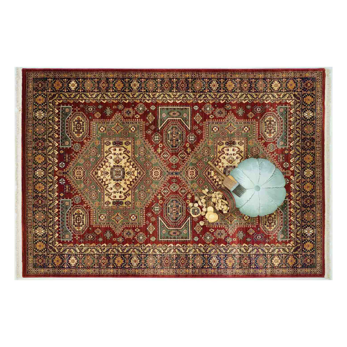 Μηχανοποίητο χαλί 160x230 της εταιρείας Ezzo από τη σειρά Orient σε μπορντώ χρώμα με ώχρα-πράσινες λεπτομέρειες και έθνικ σχέδιο. Μπορεί να τοποθετηθεί σε όλους τους χώρους του σπιτιού, αναβαθμίζοντας την αισθητική τους. Είναι κατασκευασμένο ανεξίτηλα νήματα σύνθεσης 100% heatset πολυπροπυλένιο. Tο βάρος του χαλιού είναι 3.000gsm, ενώ η πυκνότητά του ανέρχεται στους 960.000 κόμπους/τ.μ. Η απαλή επιφάνεια του χαλιού σε συνδυασμό με το πέλος ύψους 11mm, εξασφαλίζουν μία μοναδική αίσθηση στο πάτημα. Στο τελείωμα έχει κρόσσι. Διαθέτει υφαντό υπόστρωμα από 100% βαμβάκι. Λόγω του βαμβακερού υποστρώματος το χαλί είναι φυσικό να έχει μια συρρίκνωση στο μήκος και το φάρδος έως 5%. Η υψηλή του πυκνότητα σε συνδυασμό με το βαμβακερό στημόνι δίνουν την αίσθηση αυθεντικού χειροποίητου χαλιού. Η εξαιρετική ποιότητα και ειδική επεξεργασία των νημάτων, που αποτρέπουν την απορρόφηση οποιουδήποτε λεκέ, συμβάλλουν στην ανθεκτικότητα στους λεκέδες, καθιστούν το χαλί αλέκιαστο και τη συντήρησή του εύκολη. Είναι αντιστατικό επομένως δεν μαγνητίζονται χνούδια, μικροσωματίδια και σκόνη στην επιφάνεια του χαλιού, ενώ το σκούπισμα με ηλεκτρική σκούπα είναι εύκολο και αποτελεσματικό. Τα χαλιά της εταιρείας Ezzo είναι υποαλλεργικά και αντιβακτηριδιακά. Έχουν ελεγχθεί για τον οικολογικό τους χαρακτήρα καθώς και για την πλήρη απουσία επιβλαβών για την υγεία ουσιών, σύμφωνα με τις απαιτήσεις του κορυφαίου Γερμανικού Ινστιτούτου Oeko-Tex Standard 100. Πρόκειται για προϊόντα ασφαλή για την υγεία και φιλικά προς το περιβάλλον και τα κατοικίδια.