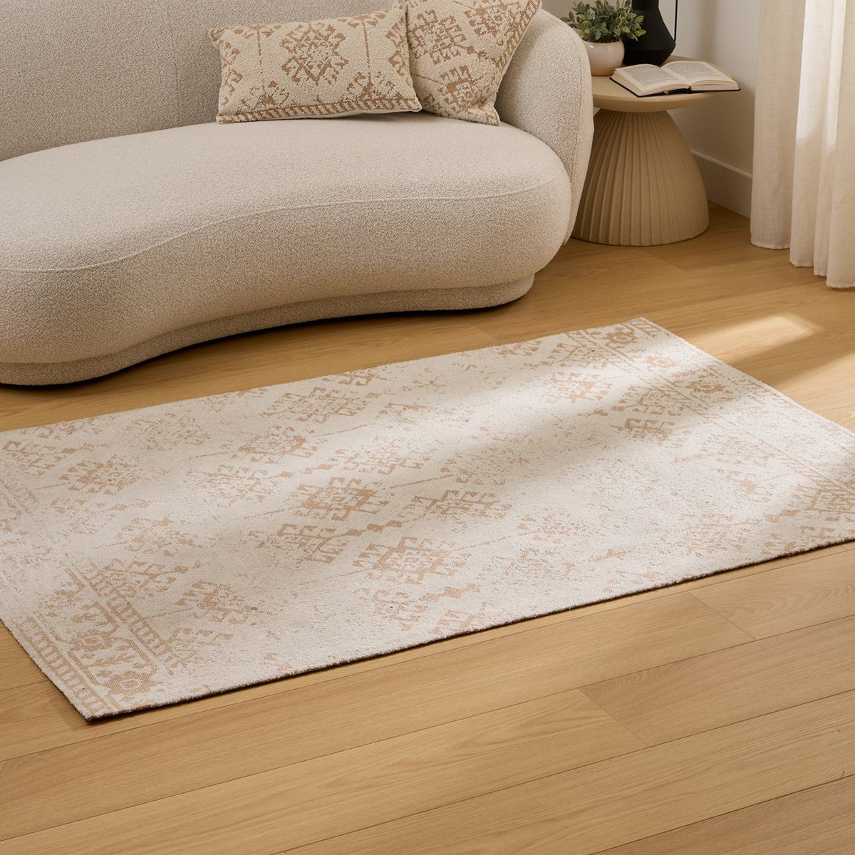 Χαλί μηχανής 120x170 με μοντέρνο ύφος, ιδανικό για όλους τους χώρους του σπιτιού. Είναι κατασκευασμένο από βαμβάκι και polyester σε μπεζ χρώμα με έθνικ σχέδιο. Είναι ένα ξεχωριστό κομμάτι που θα διακοσμήσει μοναδικά το χώρο σας καθ' όλη τη διάρκεια του χρόνου. Συνδυάστε το με τα υπόλοιπα προϊόντα του ίδιου σετ για ένα ολοκληρωμένο αποτέλεσμα.