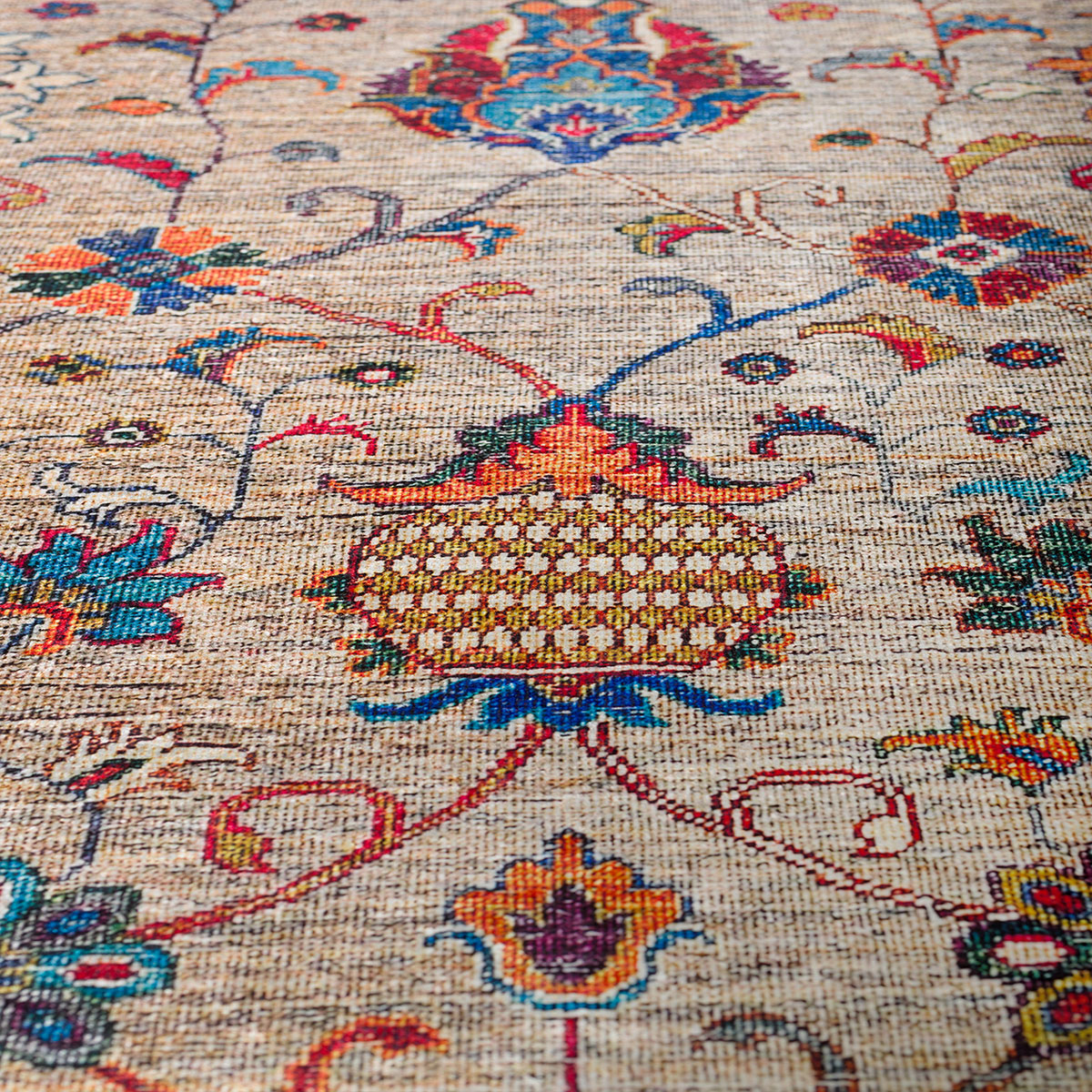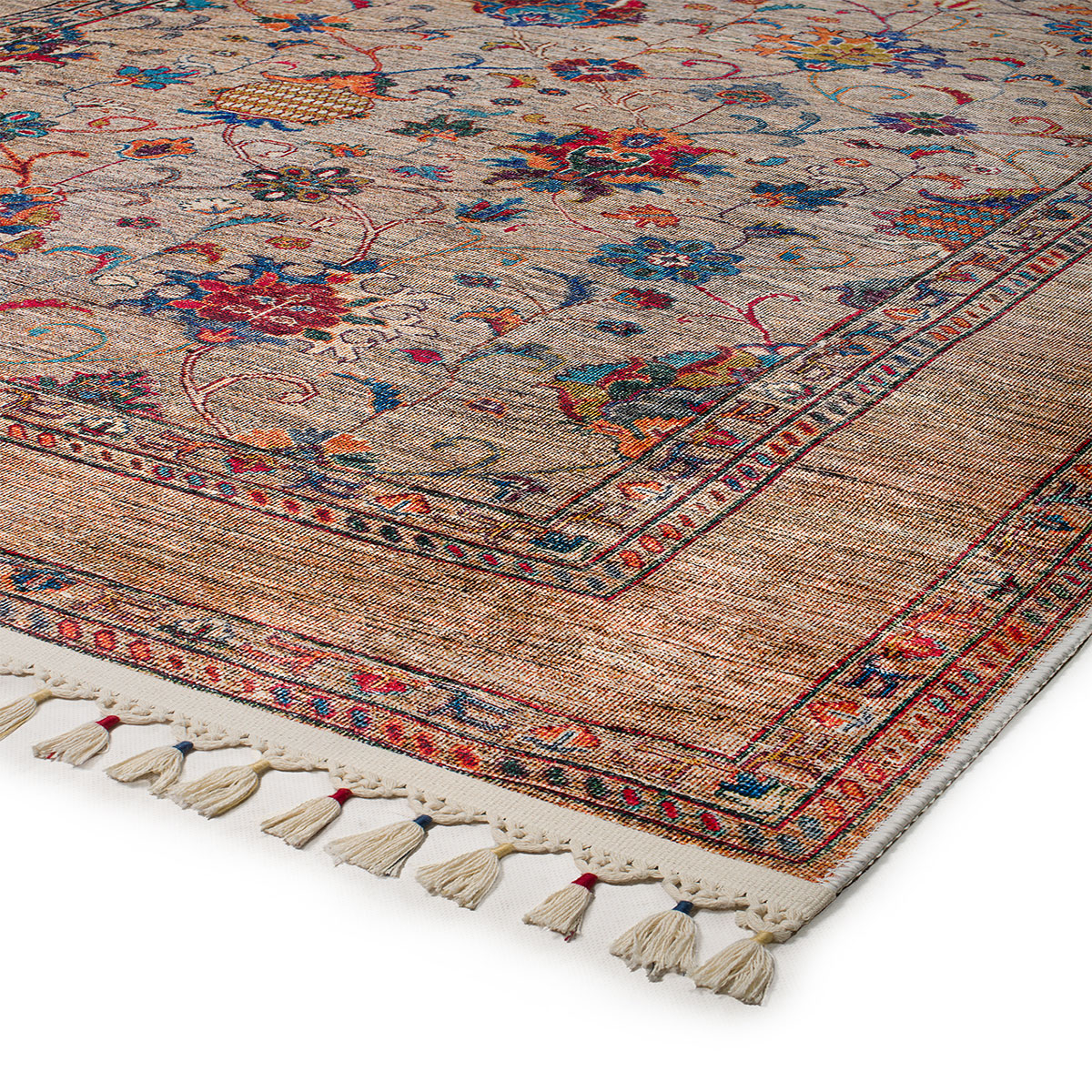 Χαλί μηχανής 4 εποχών 120x180 από την συλλογή Nomadian της εταιρείας Βιοκαρπέτ. Έχει μπεζ χρώμα με πολύχρωμες λεπτομέρειες και έθνικ σχέδιο. Πρόκειται για εξαιρετικό σταμπωτό χαλί με καλοδουλεμένη μίξη χρωμάτων. Είναι κατασκευασμένο από ανεξίτηλα νήματα σύνθεσης 60% βαμβάκι και 40% polyester. Διαθέτει υφαντό αντιολισθητικό υπόστρωμα. Έχει κρόσσια στο τελείωμα. Επειδή περιέχει και βαμβακερά νήματα, μετά την επεξεργασία του ενδέχεται να προκαλέσει συρρίκνωση 3-5% στις αρχικές διαστάσεις του χαλιού. Είναι αντιστατικό άρα το σκούπισμα με ηλεκτρική σκούπα είναι εύκολο και αποτελεσματικό. Μπορεί να τοποθετηθεί σε όλους τους χώρους του σπιτιού. Τα χαλιά της εταιρείας Βιοκαρπέτ είναι υποαλλεργικά και φιλικά προς την υγεία και το περιβάλλον.