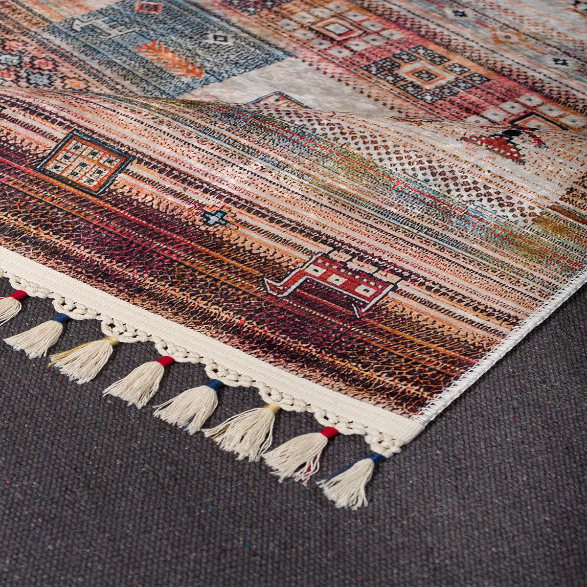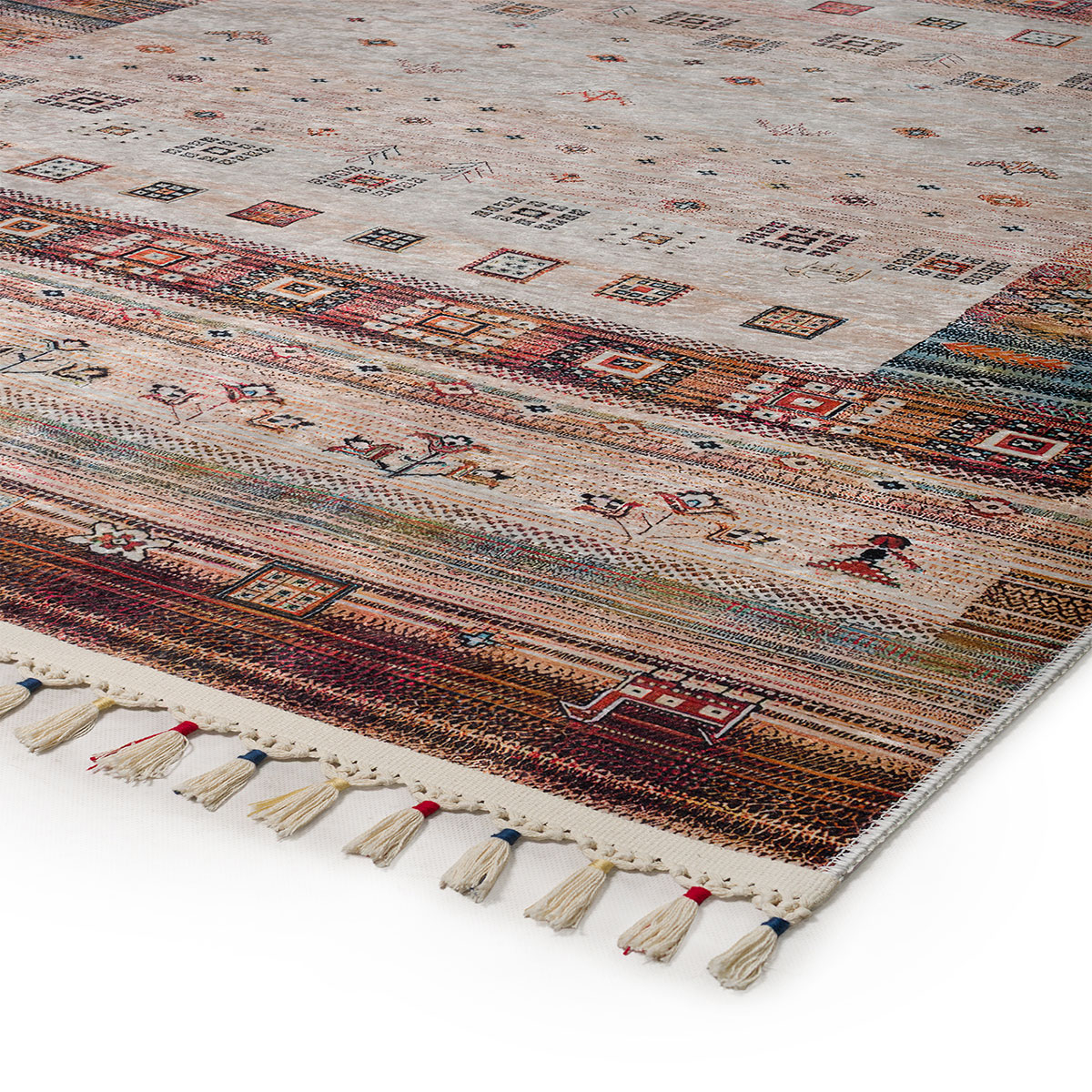Χαλί μηχανής 4 εποχών 120x180 από την συλλογή Nomadian της εταιρείας Βιοκαρπέτ. Έχει μπεζ χρώμα με καφέ-μπλε λεπτομέρειες και έθνικ σχέδιο. Πρόκειται για εξαιρετικό σταμπωτό χαλί με καλοδουλεμένη μίξη χρωμάτων. Είναι κατασκευασμένο από ανεξίτηλα νήματα σύνθεσης 60% βαμβάκι και 40% polyester. Διαθέτει υφαντό αντιολισθητικό υπόστρωμα. Έχει κρόσσια στο τελείωμα. Επειδή περιέχει και βαμβακερά νήματα, μετά την επεξεργασία του ενδέχεται να προκαλέσει συρρίκνωση 3-5% στις αρχικές διαστάσεις του χαλιού. Είναι αντιστατικό άρα το σκούπισμα με ηλεκτρική σκούπα είναι εύκολο και αποτελεσματικό. Μπορεί να τοποθετηθεί σε όλους τους χώρους του σπιτιού. Τα χαλιά της εταιρείας Βιοκαρπέτ είναι υποαλλεργικά και φιλικά προς την υγεία και το περιβάλλον.