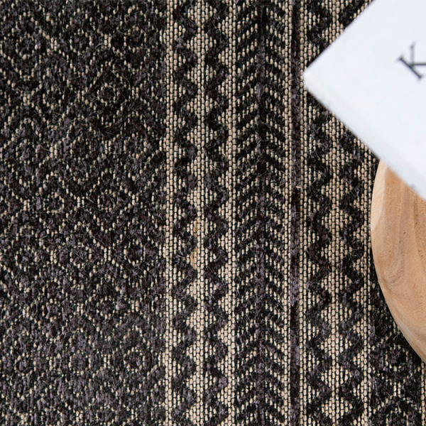 Μηχανοποίητο χαλί 4 εποχών 120x180 από τη συλλογή Gloria Cotton της εταιρείας Royal Carpet. Έχει ανθρακί χρώμα με μπεζ λεπτομέρειες και εντυπωσιακό γεωμετρικό σχέδιο. Είναι κατασκευασμένο από 55% ανακυκλωμένο βαμβάκι, 25% chenille polyester και 20% jute. Το βάρος του χαλιού είναι 2.200gsm και διαθέτει υφαντό υπόστρωμα και χαμηλό πέλος. Ιδιαίτερο χαλί για όλες τις εποχές του χρόνου, που θα απογειώσει τον χώρο σας με την ποιότητα κατασκευής του. Μπορεί να τοποθετηθεί σε όλους τους χώρους του σπιτιού αναβαθμίζοντας την αισθητική τους. Ελαφρύ χαλί, ανθεκτικό στην καθημερινή χρήση και εύκολο ως προς τον καθαρισμό του. Είναι αντιστατικό επομένως δεν μαγνητίζονται χνούδια, μικροσωματίδια και σκόνη στην επιφάνειά του, ενώ το σκούπισμα με ηλεκτρική σκούπα είναι εύκολο. Δεν εμπεριέχει επικίνδυνες για τον ανθρώπινο οργανισμό αλλεργιογόνες ή χημικές βλαβερές ουσίες. Τα χαλιά της εταιρείας Royal Carpet είναι φιλικά προς την υγεία και το περιβάλλον, καθώς είναι υποαλλεργικά και οικολογικά.