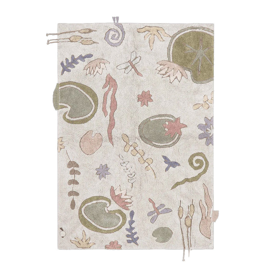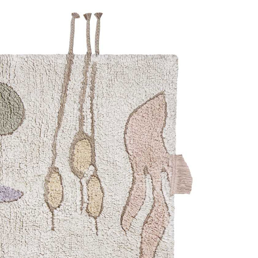 Χειροποίητο χαλί 4 εποχών σε εκρού χρώμα, με ροζ-χακί λεπτομέρειες και μοντέρνο σχέδιο από την εταιρεία Lorena Canals. Είναι κατασκευασμένο από 100% φυσικό βαμβάκι και μη τοξικές βαφές. Κάθε χαλί είναι μοναδικό, επομένως μπορεί να υπάρχουν μικρές διαφορές στο χρώμα και το σχήμα. Πληροί όλες τις προδιαγραφές ποιότητας και ασφάλειας για τα παιδιά, ενώ έχει πιστοποιημένο οργανικό βαμβακερό ύφασμα από GOTS, Ευρωπαϊκό πρότυπο για την ασφάλεια των παιχνιδιών, ASTM F963-17. Κατάλληλο και για χώρους με ενδοδαπέδια θέρμανση. Είναι φυσιολογικό το χαλί να απελευθερώνει χνούδι λόγω του χειροποίητου τρόπου κατασκευής. Η βάση του χαλιού είναι κατασκευασμένη από νήματα RugCycled®.