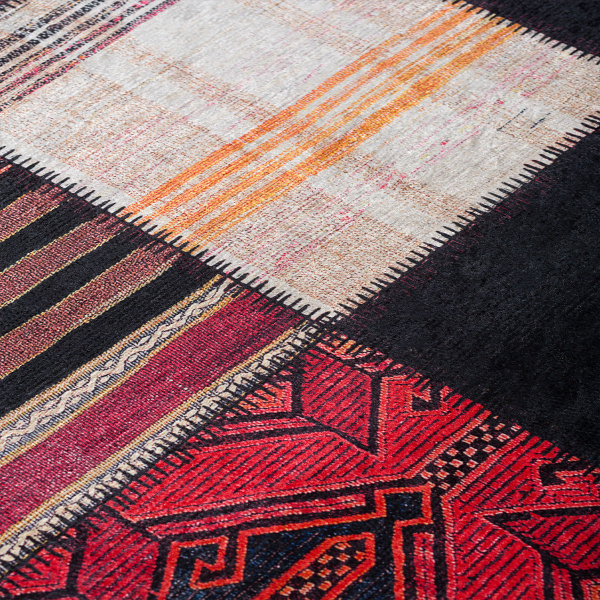Χαλί μηχανής 4 εποχών 160x230 από την συλλογή Nomadian της εταιρείας Βιοκαρπέτ. Είναι πολύχρωμο με σχέδιο patchwork. Πρόκειται για εξαιρετικό σταμπωτό χαλί με καλοδουλεμένη μίξη χρωμάτων. Είναι κατασκευασμένο από ανεξίτηλα νήματα σύνθεσης 60% βαμβάκι και 40% polyester. Διαθέτει υφαντό αντιολισθητικό υπόστρωμα. Έχει κοντό κρόσσι στο τελείωμα. Επειδή περιέχει και βαμβακερά νήματα, μετά την επεξεργασία του ενδέχεται να προκαλέσει συρρίκνωση 3-5% στις αρχικές διαστάσεις του χαλιού. Είναι αντιστατικό άρα το σκούπισμα με ηλεκτρική σκούπα είναι εύκολο και αποτελεσματικό. Μπορεί να τοποθετηθεί σε όλους τους χώρους του σπιτιού. Τα χαλιά της εταιρείας Βιοκαρπέτ είναι υποαλλεργικά και φιλικά προς την υγεία και το περιβάλλον.