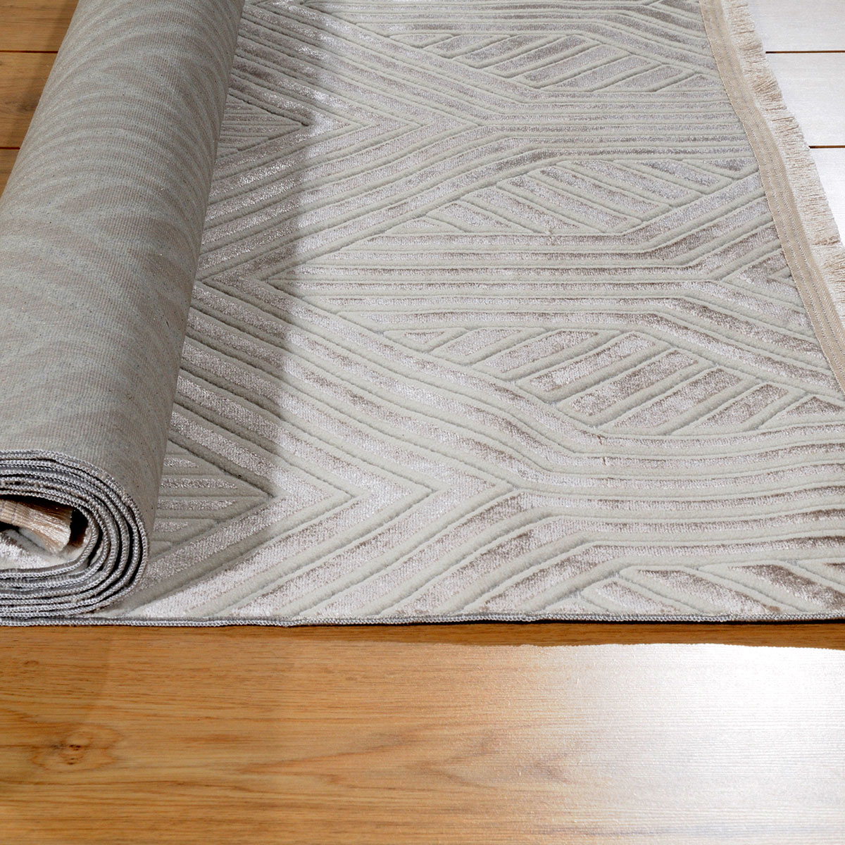 Χαλί μηχανής 4 εποχών 170x240 από την σειρά Eclipse της εταιρείας Tzikas Carpets. Έχει μπεζ-γκρι χρώμα με γεωμετρικό σχέδιο. Είναι κατασκευασμένο με ανεξίτηλα γυαλιστερά νήματα από polyester και ακρυλικό, ενώ το βάρος του είναι 1.200gsm. Η πυκνότητά του είναι 1.000.000 κόμπους/τ.μ. Έχει χαμηλό πέλος flatweave και διαθέτει κοντό κρόσσι. Το υπόστρωμά του είναι υφαντό και καθιστά το χαλί ανθεκτικό στην χρήση και τις πλύσεις. Είναι αντιστατικό επομένως δεν μαγνητίζονται χνούδια, μικροσωματίδια και σκόνη στην επιφάνεια ενώ το σκούπισμα με ηλεκτρική σκούπα είναι εύκολο και αποτελεσματικό. Τα χαλιά της εταιρείας Tzikas Carpets είναι υποαλλεργικά και φιλικά προς την υγεία και το περιβάλλον. Επίσης, έχουν πιστοποίηση του Γερμανικού ινστιτούτου Oeko-Tex Standard 100.