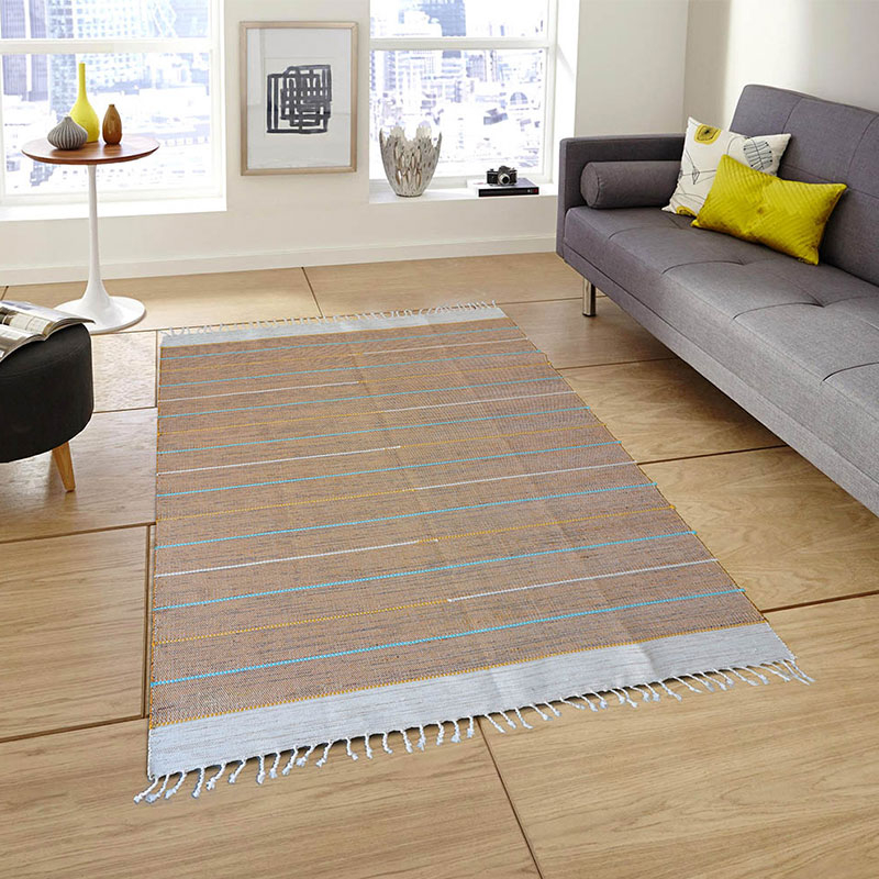 Χειροποίητο χαλί 4 εποχών 200x285 από την συλλογή Ribella της εταιρείας New Plan. Έχει μπεζ και εκρού χρώμα με κίτρινες - σιέλ ανάγλυφες λεπτομέρειες και ριγέ σχέδιο. Διαθέτει κρόσσι στο τελείωμα του. Κατάλληλο για όλες τις εποχές του χρόνου. Εκλεπτυσμένο χαλί με καλοδουλεμένη μίξη χρωμάτων, μπορεί να τοποθετηθεί σε όλους τους χώρους του σπιτιού, αναβαθμίζοντας την αισθητική τους. Είναι κατασκευασμένο με νήματα από 100% Αιγυπτιακό βαμβάκι Α' ποιότητας, που το καθιστά ιδιαίτερα μαλακό. Το βάρος του χαλιού είναι 1.300 γραμμ./τ.μ. Διαθέτει αντιολισθητικό υπόστρωμα που προσφέρει σταθερότητα. Η αντιολισθητική ιδιότητα μειώνεται μετα τις πρώτες πλύσεις. Είναι αντιστατικό άρα το σκούπισμα με ηλεκτρική σκούπα είναι εύκολο και αποτελεσματικό. Τα χαλιά της σειράς Ribella είναι οικολογικά και υποαλλεργικά.