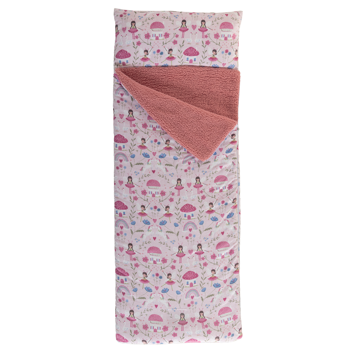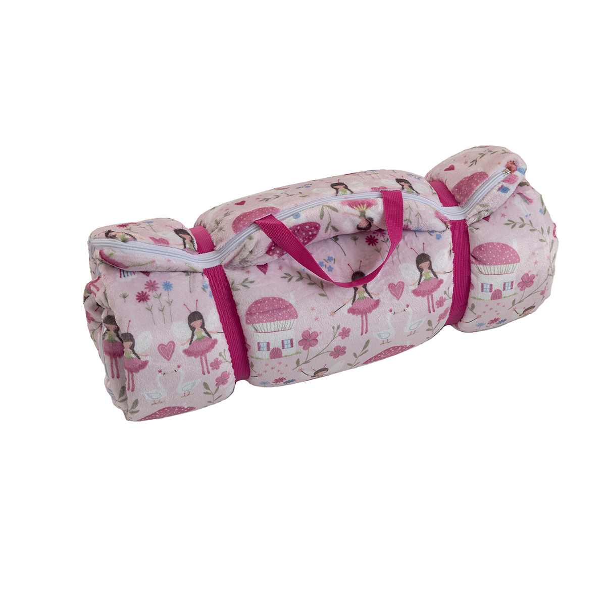 Υπνόσακος παιδικός σε ροζ χρώμα, με φούξια λεπτομέρειες και παιδικές φιγούρες σχέδιο από την εταιρεία Palamaiki. Διαθέτει ενσωματωμένο μαξιλάρι κλείνει με φερμουάρ. Είναι κατασκευασμένος από 100% fleece φανελένιο ύφασμα εξωτερικά ενώ εσωτερικά διαθέτει γουνάκι sherpa. Γίνεται ρολάκι με την βοήθεια των ιμάντων που διαθέτει για εύκολη αποθήκευση.
