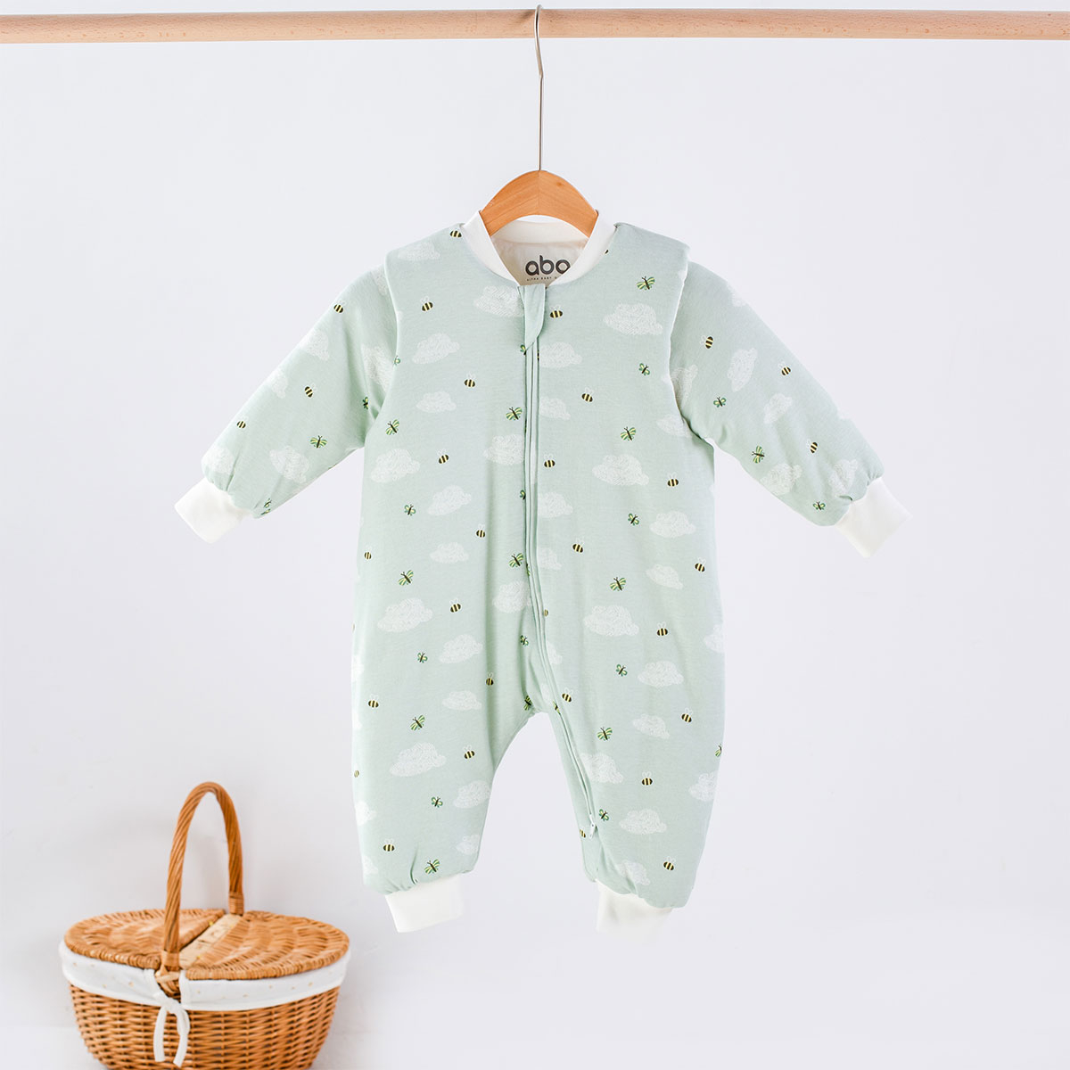 Βρεφικός υπνόσακος από την εταιρεία Abo σε βεραμάν χρώμα με συννεφάκια στο σχέδιο. Η εξωτερική επένδυση είναι ύφασμα από 100% βαμβάκι. Η γέμισή του είναι από πολυεστερική βάτα. Έχει δείκτη θερμότητας 2,5 tog, που τον καθιστά ιδανικό για δωμάτια με θερμοκρασία 16-20 βαθμούς Κελσίου. Έχει αποσπώμενα μανίκια με μικρό και λεπτό κούμπωμα στο μπράτσο. Διαθέτει φερμουάρ διπλής κατεύθυνσης με άνοιγμα στο πάνω αλλά και στο κάτω μέρος για εύκολη αλλαγή πάνας. Οι ραφές, τα φερμουάρ και τα κουμπιά είναι σχεδιασμένα να βρίσκονται στο εσωτερικό ύφασμα κρυμμένα, ώστε να μην αγγίζουν το δέρμα του μωρού. Φοριέται σαν ρουχαλάκι, χαρίζοντάς του ελευθερία κινήσεων, επιτρέποντάς του να σηκώνεται και να περπατά. Ο υπνόσακος εξασφαλίζει σταθερή θερμοκρασία σώματος, ελαχιστοποιώντας έτσι την πιθανότητα να κρυώσει ή να υπερθερμανθεί το μωρό.