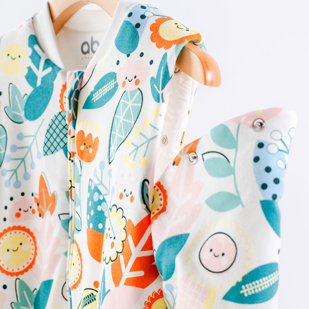 Βρεφικός υπνόσακος από την εταιρεία Abo σε λευκό φόντο με πορτοκαλί-πετρόλ φλοράλ σχέδιο. Η εξωτερική επένδυση είναι ύφασμα από 100% βαμβάκι. Η γέμισή του είναι από πολυεστερική βάτα. Έχει δείκτη θερμότητας 2,5 tog, που τον καθιστά ιδανικό για δωμάτια με θερμοκρασία 16-20 βαθμούς Κελσίου. Έχει αποσπώμενα μανίκια με μικρό και λεπτό κούμπωμα στο μπράτσο. Διαθέτει φερμουάρ διπλής κατεύθυνσης με άνοιγμα στο πάνω αλλά και στο κάτω μέρος για εύκολη αλλαγή πάνας. Οι ραφές, τα φερμουάρ και τα κουμπιά είναι σχεδιασμένα να βρίσκονται στο εσωτερικό ύφασμα κρυμμένα, ώστε να μην αγγίζουν το δέρμα του μωρού. Φοριέται σαν ρουχαλάκι, χαρίζοντάς του ελευθερία κινήσεων, επιτρέποντάς του να σηκώνεται και να περπατά. Ο υπνόσακος εξασφαλίζει σταθερή θερμοκρασία σώματος, ελαχιστοποιώντας έτσι την πιθανότητα να κρυώσει ή να υπερθερμανθεί το μωρό.