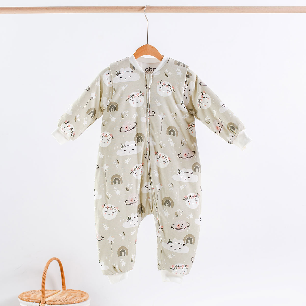 Βρεφικός υπνόσακος από την εταιρεία Abo σε μπεζ χρώμα με συννεφάκια στο σχέδιο. Η εξωτερική επένδυση είναι ύφασμα από 100% βαμβάκι. Η γέμισή του είναι από πολυεστερική βάτα. Έχει δείκτη θερμότητας 2,5 tog, που τον καθιστά ιδανικό για δωμάτια με θερμοκρασία 16-20 βαθμούς Κελσίου. Έχει αποσπώμενα μανίκια με μικρό και λεπτό κούμπωμα στο μπράτσο. Διαθέτει φερμουάρ διπλής κατεύθυνσης με άνοιγμα στο πάνω αλλά και στο κάτω μέρος για εύκολη αλλαγή πάνας. Οι ραφές, τα φερμουάρ και τα κουμπιά είναι σχεδιασμένα να βρίσκονται στο εσωτερικό ύφασμα κρυμμένα, ώστε να μην αγγίζουν το δέρμα του μωρού. Φοριέται σαν ρουχαλάκι, χαρίζοντάς του ελευθερία κινήσεων, επιτρέποντάς του να σηκώνεται και να περπατά. Ο υπνόσακος εξασφαλίζει σταθερή θερμοκρασία σώματος, ελαχιστοποιώντας έτσι την πιθανότητα να κρυώσει ή να υπερθερμανθεί το μωρό.