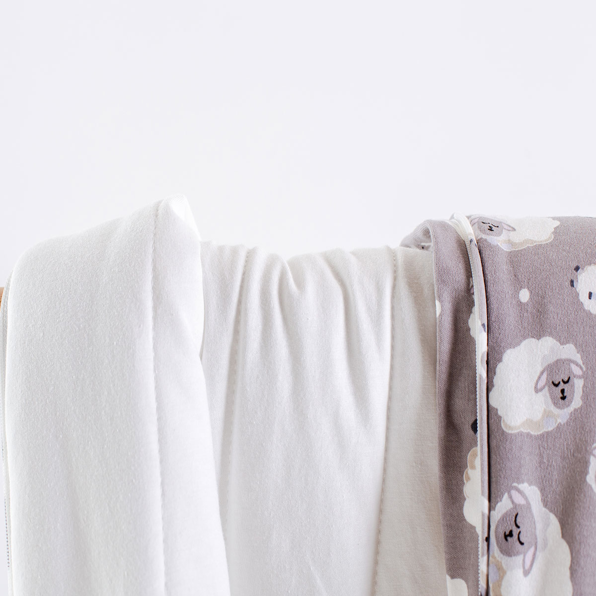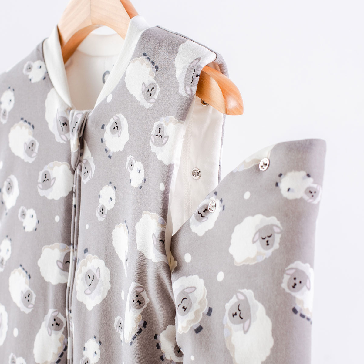 Βρεφικός υπνόσακος από την εταιρεία Abo σε γκρι χρώμα με προβατάκια στο σχέδιο. Η εξωτερική επένδυση είναι ύφασμα από 100% βαμβάκι. Η γέμισή του είναι από πολυεστερική βάτα. Έχει δείκτη θερμότητας 2,5 tog, που τον καθιστά ιδανικό για δωμάτια με θερμοκρασία 16-20 βαθμούς Κελσίου. Έχει αποσπώμενα μανίκια με μικρό και λεπτό κούμπωμα στο μπράτσο. Διαθέτει φερμουάρ διπλής κατεύθυνσης με άνοιγμα στο πάνω αλλά και στο κάτω μέρος για εύκολη αλλαγή πάνας. Οι ραφές, τα φερμουάρ και τα κουμπιά είναι σχεδιασμένα να βρίσκονται στο εσωτερικό ύφασμα κρυμμένα, ώστε να μην αγγίζουν το δέρμα του μωρού. Φοριέται σαν ρουχαλάκι, χαρίζοντάς του ελευθερία κινήσεων, επιτρέποντάς του να σηκώνεται και να περπατά. Ο υπνόσακος εξασφαλίζει σταθερή θερμοκρασία σώματος, ελαχιστοποιώντας έτσι την πιθανότητα να κρυώσει ή να υπερθερμανθεί το μωρό.