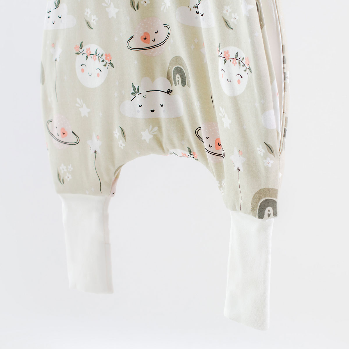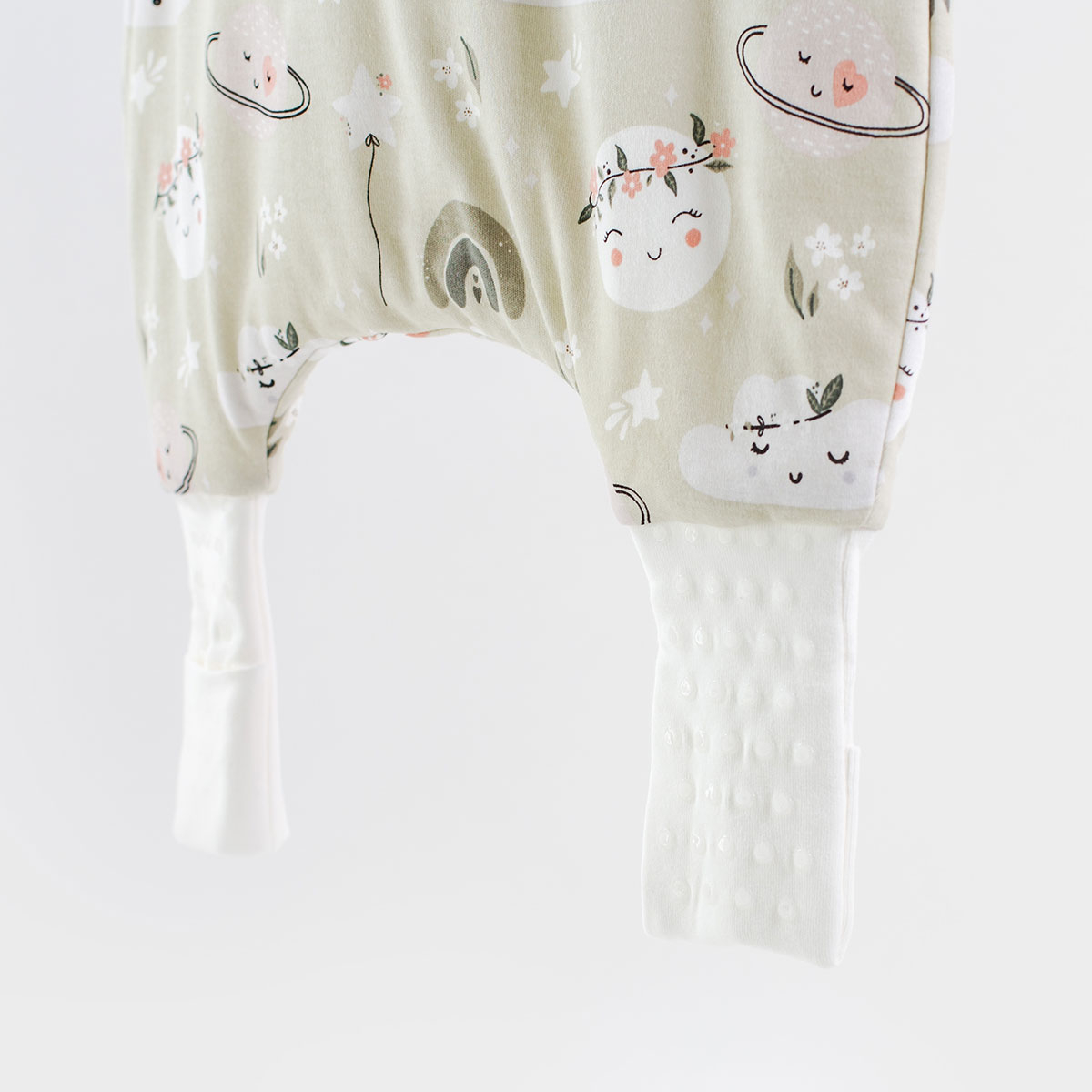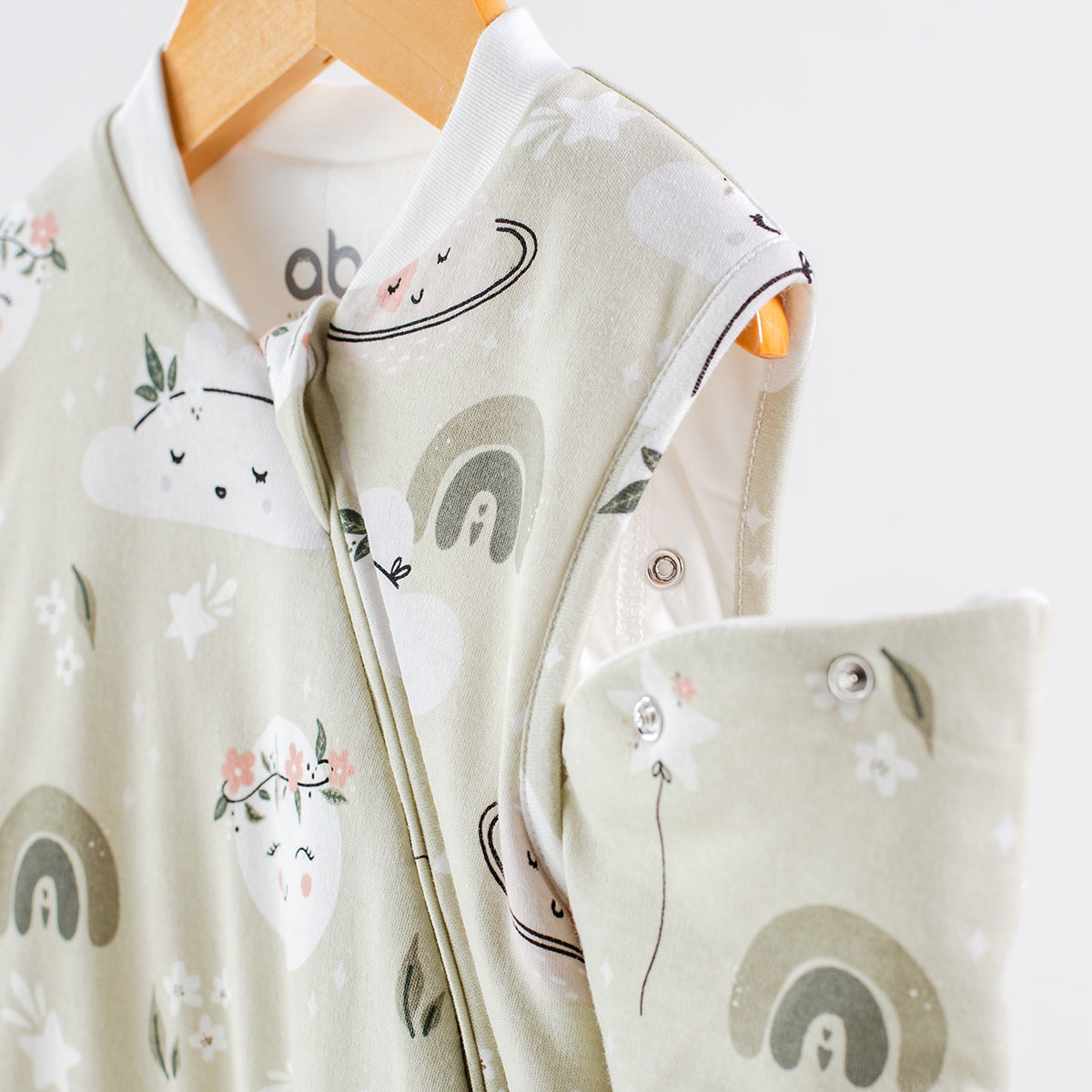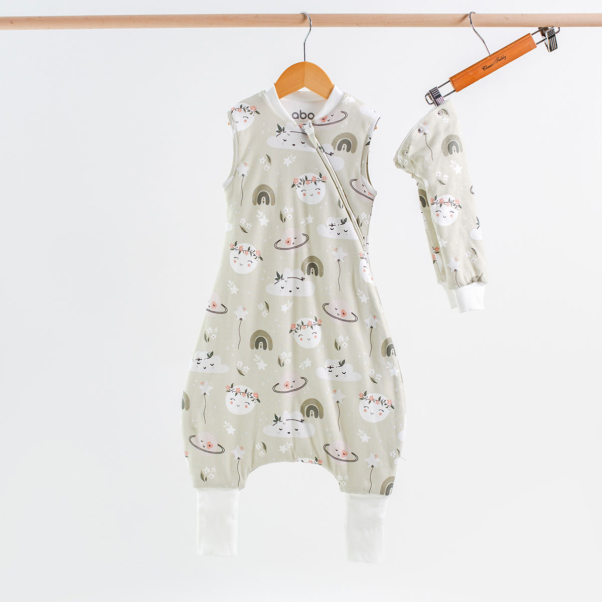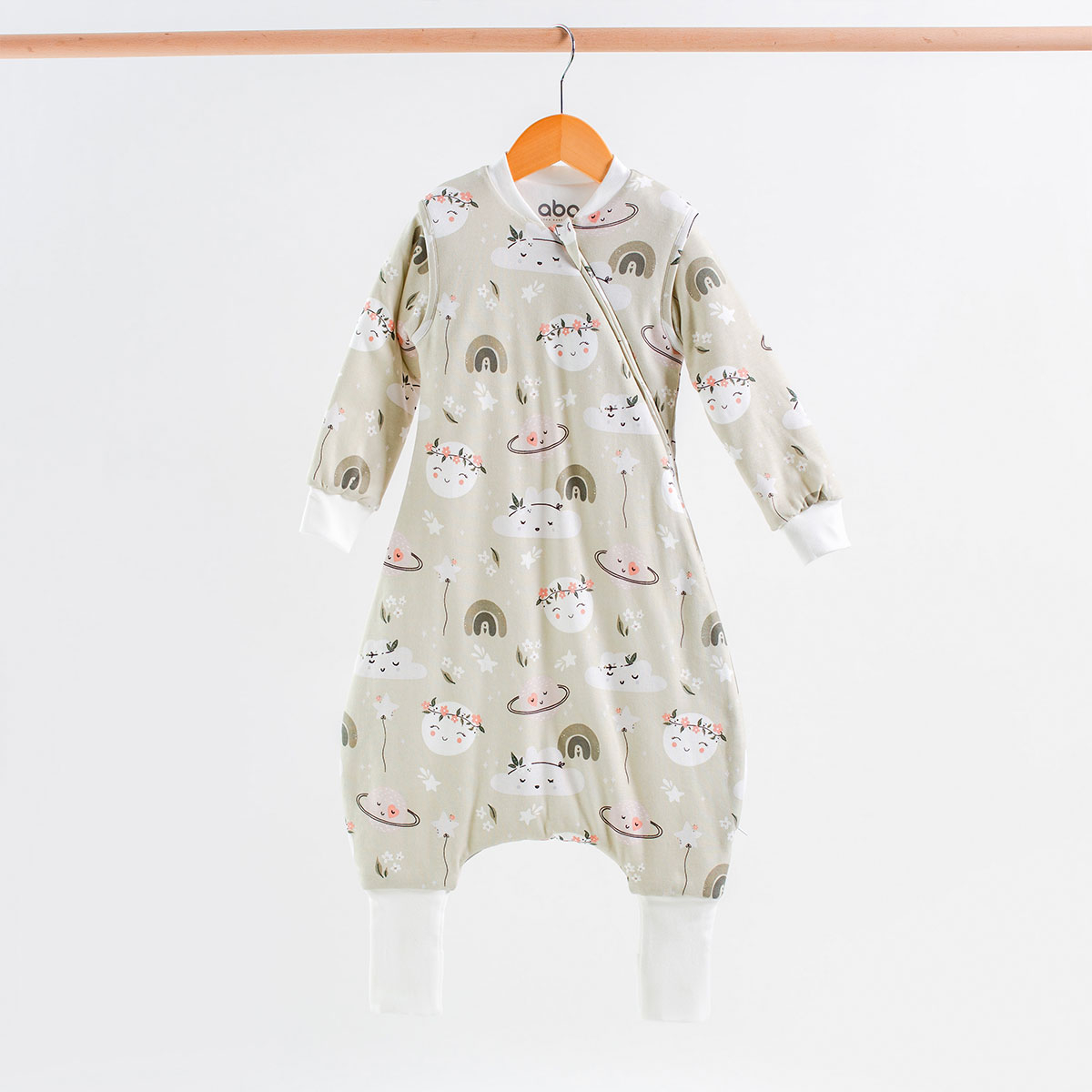 Βρεφικός υπνόσακος από την εταιρεία Abo σε μπεζ χρώμα με συννεφάκια στο σχέδιο. Η εξωτερική επένδυση είναι ύφασμα από 100% βαμβάκι. Η γέμισή του είναι από πολυεστερική βάτα. Έχει δείκτη θερμότητας 2,5 tog, που τον καθιστά ιδανικό για δωμάτια με θερμοκρασία 16-20 βαθμούς Κελσίου. Έχει αποσπώμενα μανίκια με μικρό και λεπτό κούμπωμα στο μπράτσο. Διαθέτει φερμουάρ διπλής κατεύθυνσης και αναδιπλούμενα πατουσάκια με αντιολισθητική επένδυση. Οι ραφές, τα φερμουάρ και τα κουμπιά είναι σχεδιασμένα να βρίσκονται στο εσωτερικό ύφασμα κρυμμένα, ώστε να μην αγγίζουν το δέρμα του μωρού. Φοριέται σαν ρουχαλάκι, χαρίζοντάς του ελευθερία κινήσεων, επιτρέποντάς του να σηκώνεται και να περπατά. Ο υπνόσακος εξασφαλίζει σταθερή θερμοκρασία σώματος, ελαχιστοποιώντας έτσι την πιθανότητα να κρυώσει ή να υπερθερμανθεί το μωρό.