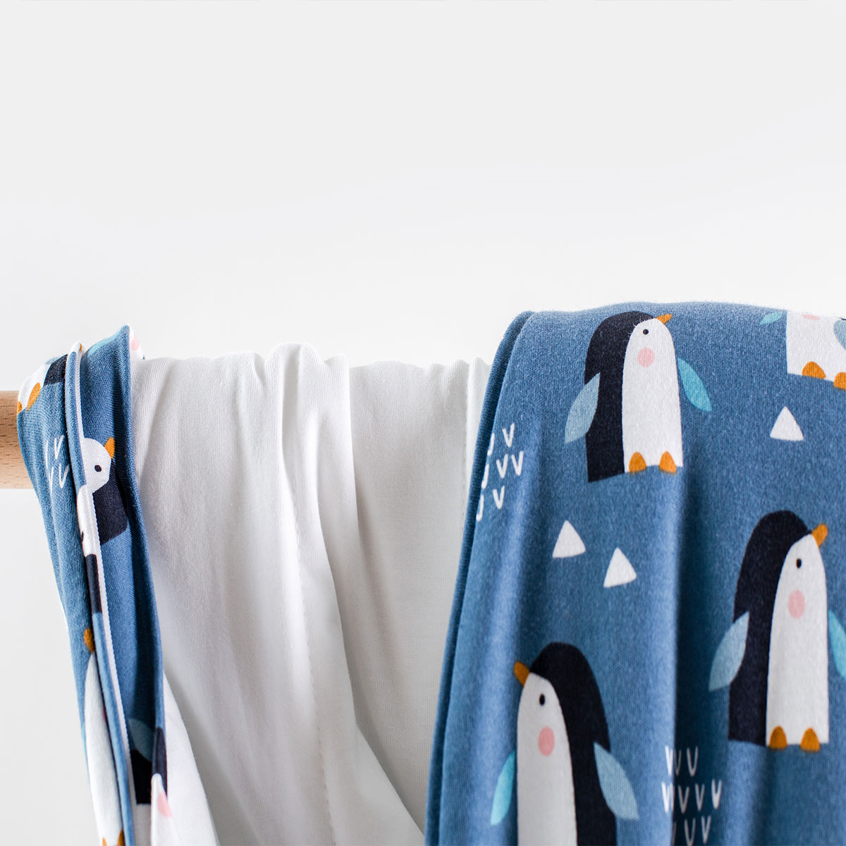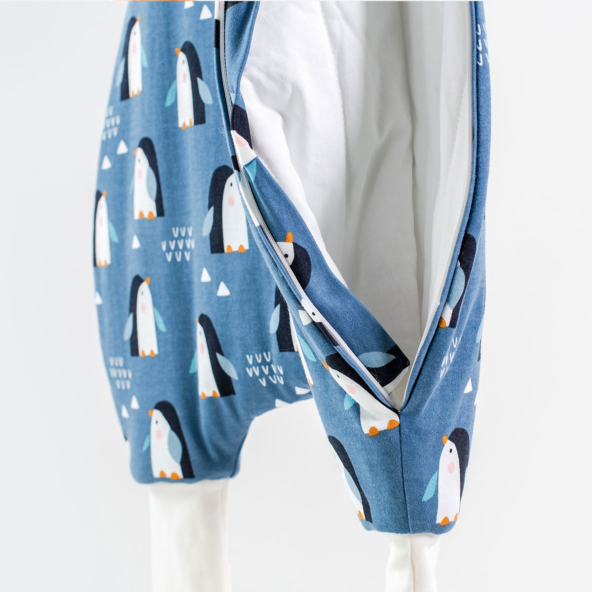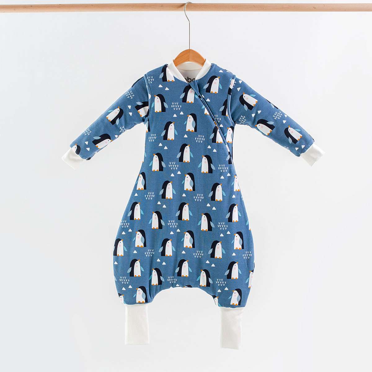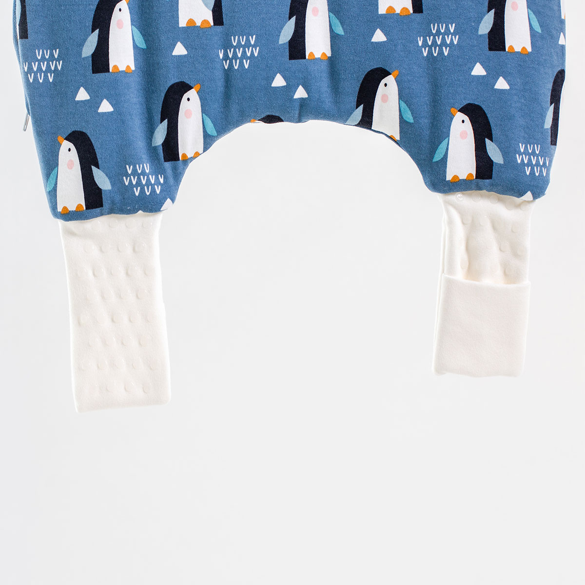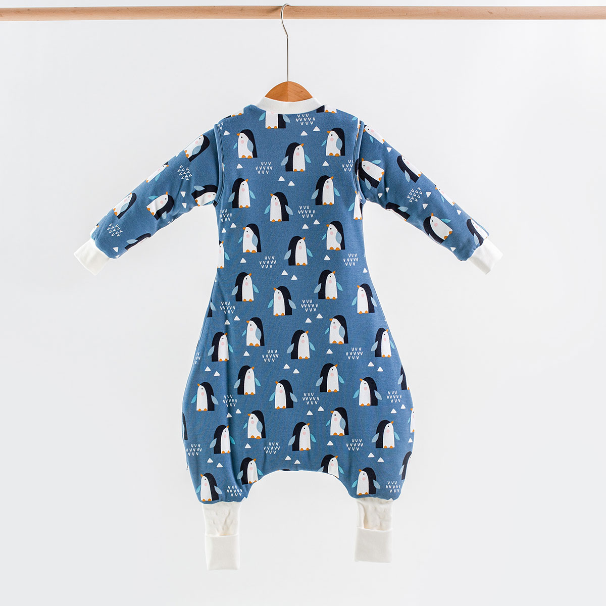 Βρεφικός υπνόσακος από την εταιρεία Abo σε μπλε χρώμα με πιγκουινάκια στο σχέδιο. Η εξωτερική επένδυση είναι ύφασμα από 100% βαμβάκι. Η γέμισή του είναι από πολυεστερική βάτα. Έχει δείκτη θερμότητας 2,5 tog, που τον καθιστά ιδανικό για δωμάτια με θερμοκρασία 16-20 βαθμούς Κελσίου. Έχει αποσπώμενα μανίκια με μικρό και λεπτό κούμπωμα στο μπράτσο. Διαθέτει φερμουάρ διπλής κατεύθυνσης και αναδιπλούμενα πατουσάκια με αντιολισθητική επένδυση. Οι ραφές, τα φερμουάρ και τα κουμπιά είναι σχεδιασμένα να βρίσκονται στο εσωτερικό ύφασμα κρυμμένα, ώστε να μην αγγίζουν το δέρμα του μωρού. Φοριέται σαν ρουχαλάκι, χαρίζοντάς του ελευθερία κινήσεων, επιτρέποντάς του να σηκώνεται και να περπατά. Ο υπνόσακος εξασφαλίζει σταθερή θερμοκρασία σώματος, ελαχιστοποιώντας έτσι την πιθανότητα να κρυώσει ή να υπερθερμανθεί το μωρό.