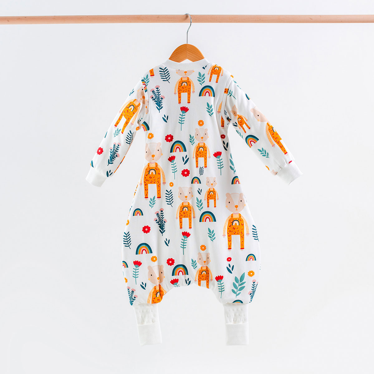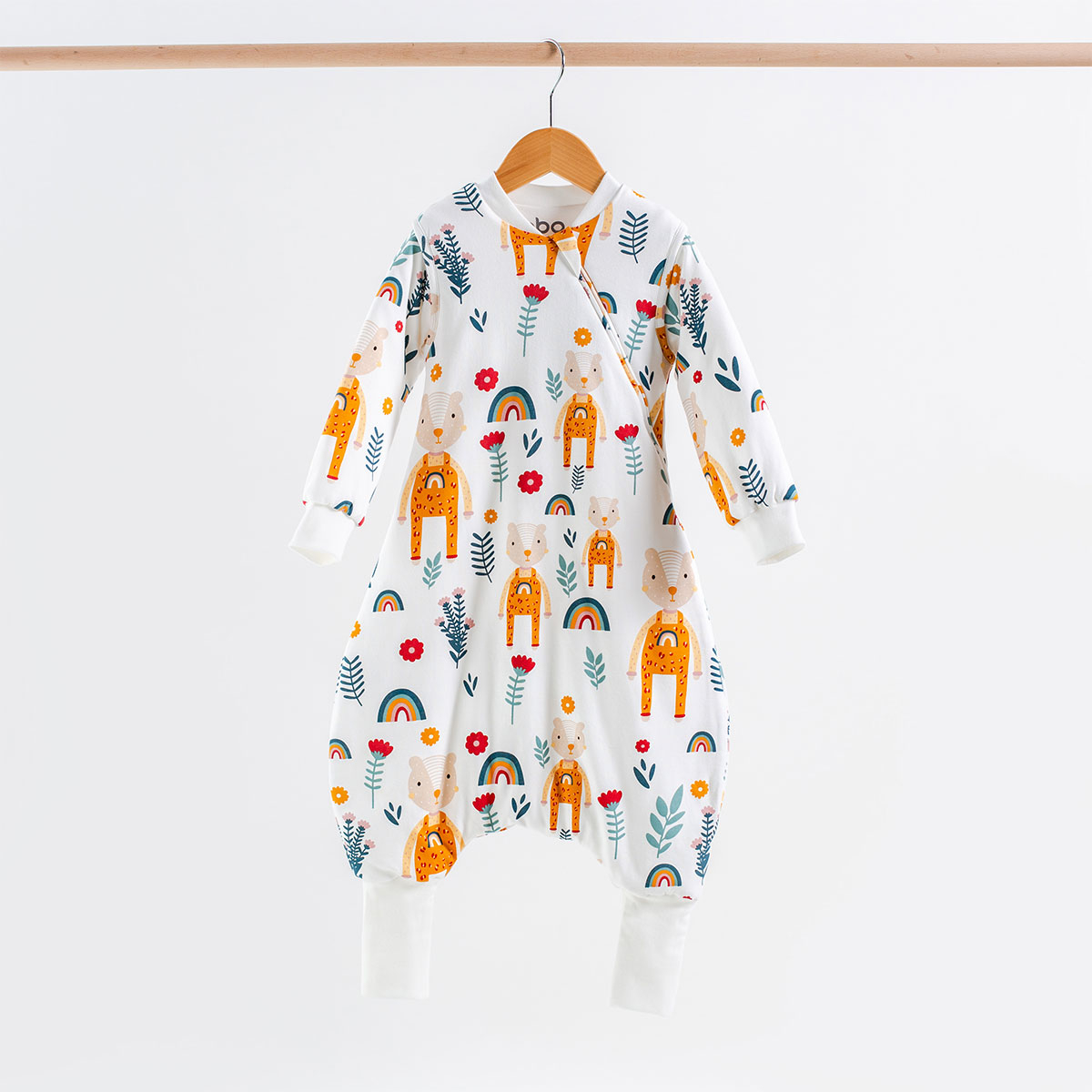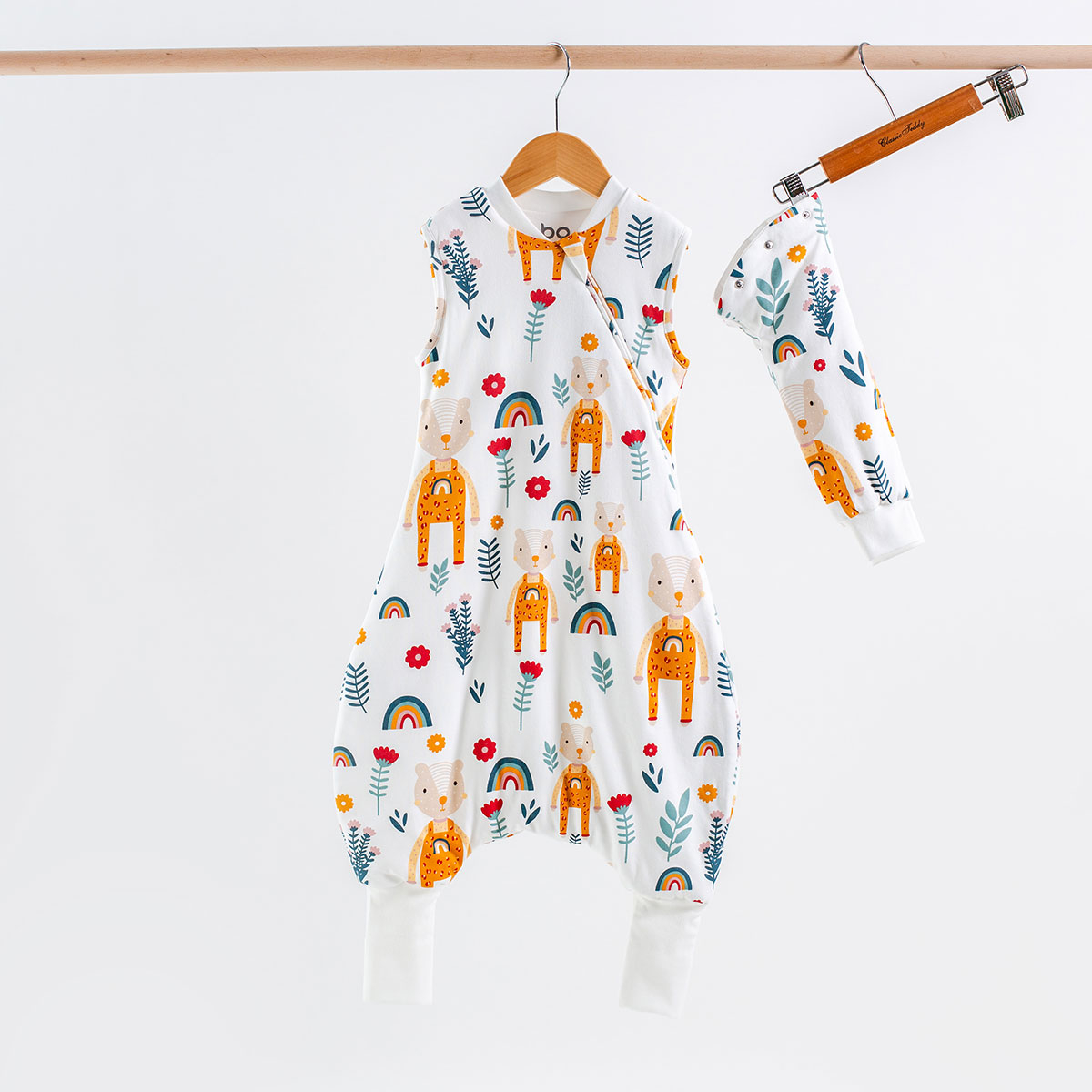 Βρεφικός υπνόσακος από την εταιρεία Abo σε λευκό φόντο με πολύχρωμο σχέδιο με ζωάκια και ουράνια τόξα. Η εξωτερική επένδυση είναι ύφασμα από 100% βαμβάκι. Η γέμισή του είναι από πολυεστερική βάτα. Έχει δείκτη θερμότητας 2,5 tog, που τον καθιστά ιδανικό για δωμάτια με θερμοκρασία 16-20 βαθμούς Κελσίου. Έχει αποσπώμενα μανίκια με μικρό και λεπτό κούμπωμα στο μπράτσο. Διαθέτει φερμουάρ διπλής κατεύθυνσης και αναδιπλούμενα πατουσάκια με αντιολισθητική επένδυση. Οι ραφές, τα φερμουάρ και τα κουμπιά είναι σχεδιασμένα να βρίσκονται στο εσωτερικό ύφασμα κρυμμένα, ώστε να μην αγγίζουν το δέρμα του μωρού. Φοριέται σαν ρουχαλάκι, χαρίζοντάς του ελευθερία κινήσεων, επιτρέποντάς του να σηκώνεται και να περπατά. Ο υπνόσακος εξασφαλίζει σταθερή θερμοκρασία σώματος, ελαχιστοποιώντας έτσι την πιθανότητα να κρυώσει ή να υπερθερμανθεί το μωρό.
