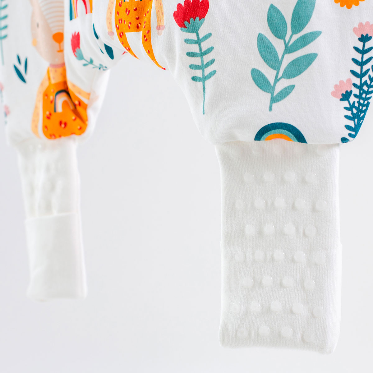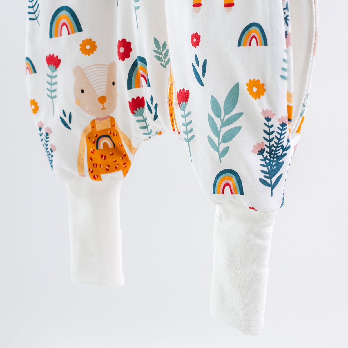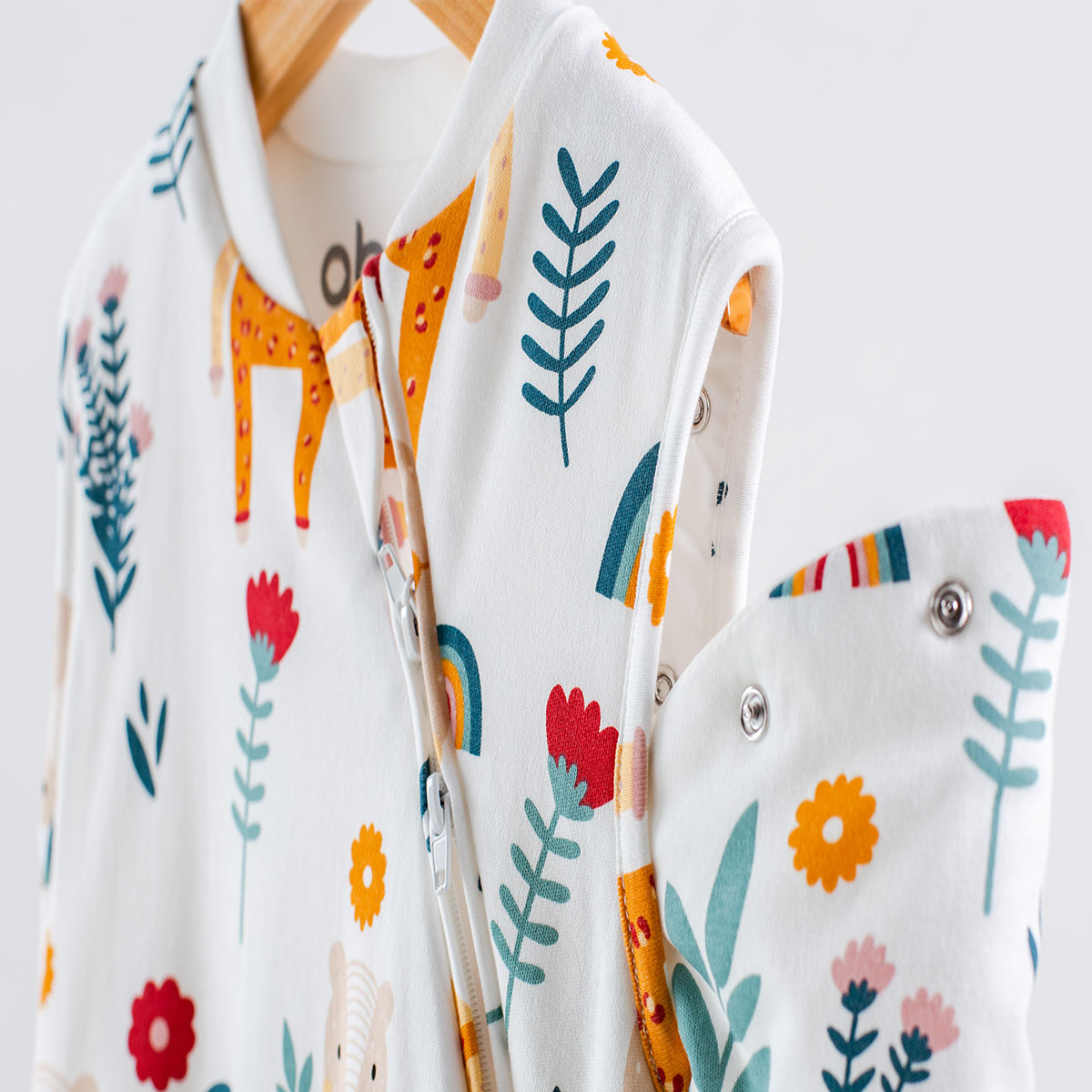 Βρεφικός υπνόσακος από την εταιρεία Abo σε λευκό φόντο με πολύχρωμο σχέδιο με ζωάκια και ουράνια τόξα. Η εξωτερική επένδυση είναι ύφασμα από 100% βαμβάκι. Η γέμισή του είναι από πολυεστερική βάτα. Έχει δείκτη θερμότητας 2,5 tog, που τον καθιστά ιδανικό για δωμάτια με θερμοκρασία 16-20 βαθμούς Κελσίου. Έχει αποσπώμενα μανίκια με μικρό και λεπτό κούμπωμα στο μπράτσο. Διαθέτει φερμουάρ διπλής κατεύθυνσης και αναδιπλούμενα πατουσάκια με αντιολισθητική επένδυση. Οι ραφές, τα φερμουάρ και τα κουμπιά είναι σχεδιασμένα να βρίσκονται στο εσωτερικό ύφασμα κρυμμένα, ώστε να μην αγγίζουν το δέρμα του μωρού. Φοριέται σαν ρουχαλάκι, χαρίζοντάς του ελευθερία κινήσεων, επιτρέποντάς του να σηκώνεται και να περπατά. Ο υπνόσακος εξασφαλίζει σταθερή θερμοκρασία σώματος, ελαχιστοποιώντας έτσι την πιθανότητα να κρυώσει ή να υπερθερμανθεί το μωρό.