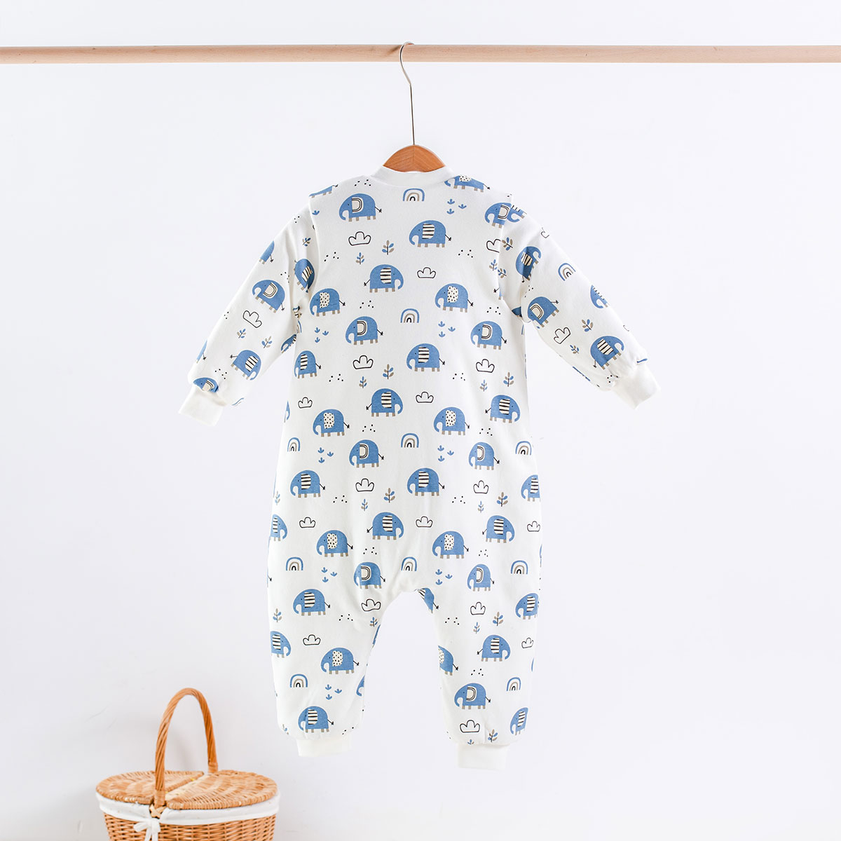 Παιδικός υπνόσακος από την εταιρεία Abo σε λευκό φόντο με μπλε ελεφαντάκια στο σχέδιο. Η εξωτερική επένδυση είναι ύφασμα από 100% βαμβάκι. Η γέμισή του είναι από πολυεστερική βάτα. Έχει δείκτη θερμότητας 2,5 tog, που τον καθιστά ιδανικό για δωμάτια με θερμοκρασία 16-20 βαθμούς Κελσίου. Έχει αποσπώμενα μανίκια με μικρό και λεπτό κούμπωμα στο μπράτσο. Διαθέτει φερμουάρ διπλής κατεύθυνσης με άνοιγμα στο πάνω αλλά και στο κάτω μέρος, προσφέροντας ευκολία στη χρήση της τουαλέτας. Οι ραφές, τα φερμουάρ και τα κουμπιά είναι σχεδιασμένα να βρίσκονται στο εσωτερικό ύφασμα κρυμμένα, ώστε να μην αγγίζουν το δέρμα του παιδιού. Φοριέται σαν ρουχαλάκι, χαρίζοντάς του ελευθερία κινήσεων, επιτρέποντάς του να σηκώνεται και να περπατά. Ο υπνόσακος εξασφαλίζει σταθερή θερμοκρασία σώματος, ελαχιστοποιώντας έτσι την πιθανότητα να κρυώσει ή να υπερθερμανθεί το μωρό.