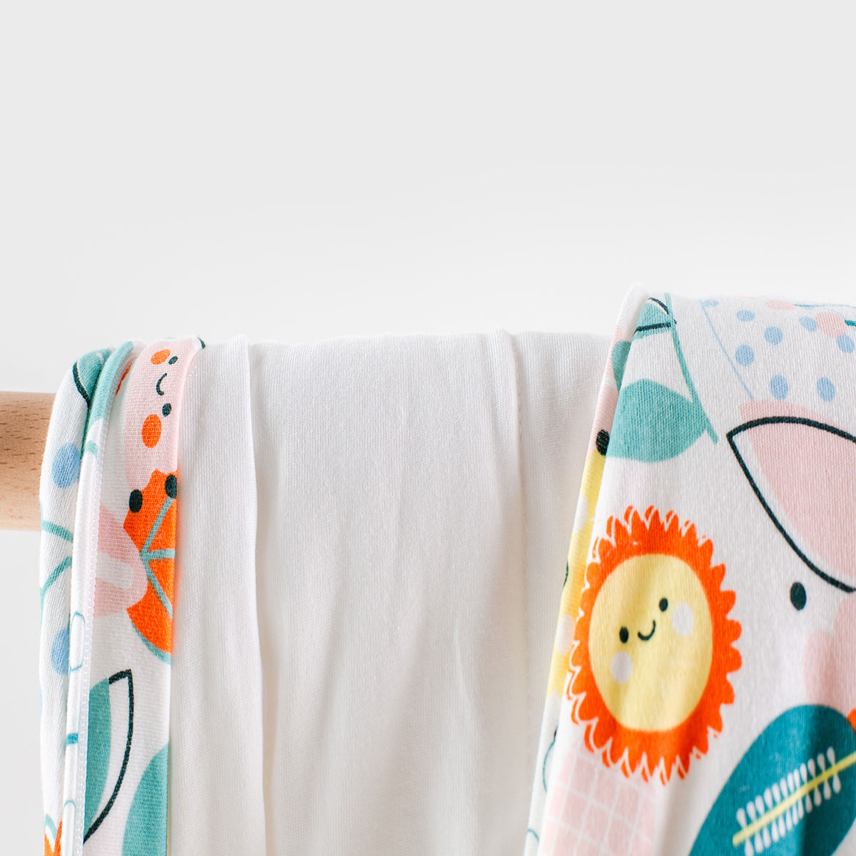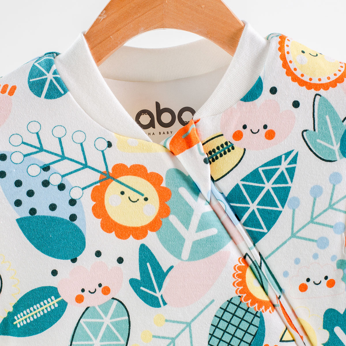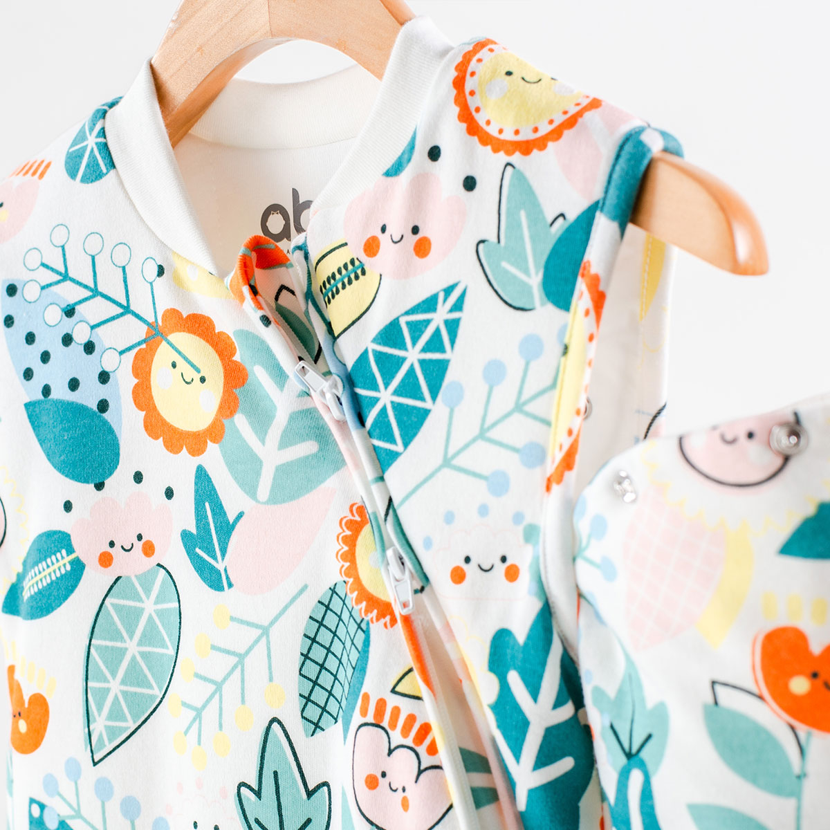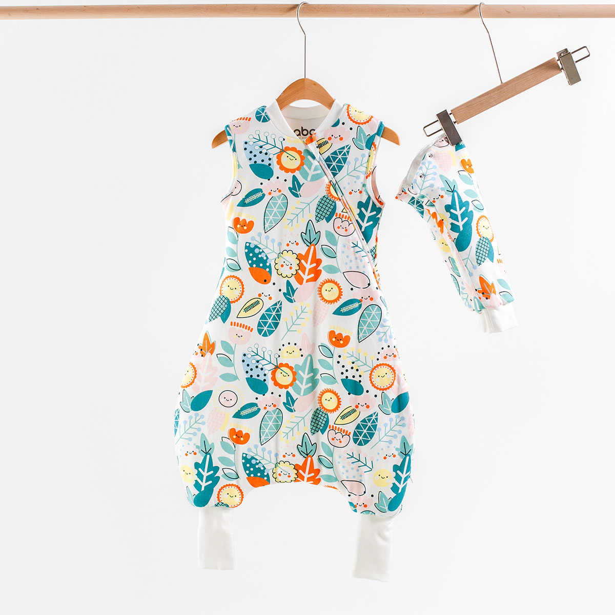 Βρεφικός υπνόσακος από την εταιρεία Abo σε λευκό φόντο με πορτοκαλί-πετρόλ φλοράλ σχέδιο. Η εξωτερική επένδυση είναι ύφασμα από 100% βαμβάκι. Η γέμισή του είναι από πολυεστερική βάτα. Έχει δείκτη θερμότητας 2,5 tog, που τον καθιστά ιδανικό για δωμάτια με θερμοκρασία 16-20 βαθμούς Κελσίου. Έχει αποσπώμενα μανίκια με μικρό και λεπτό κούμπωμα στο μπράτσο. Διαθέτει φερμουάρ διπλής κατεύθυνσης και αναδιπλούμενα πατουσάκια με αντιολισθητική επένδυση. Οι ραφές, τα φερμουάρ και τα κουμπιά είναι σχεδιασμένα να βρίσκονται στο εσωτερικό ύφασμα κρυμμένα, ώστε να μην αγγίζουν το δέρμα του μωρού. Φοριέται σαν ρουχαλάκι, χαρίζοντάς του ελευθερία κινήσεων, επιτρέποντάς του να σηκώνεται και να περπατά. Ο υπνόσακος εξασφαλίζει σταθερή θερμοκρασία σώματος, ελαχιστοποιώντας έτσι την πιθανότητα να κρυώσει ή να υπερθερμανθεί το μωρό.