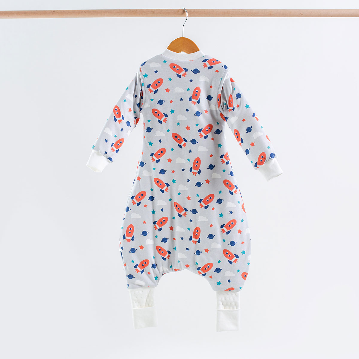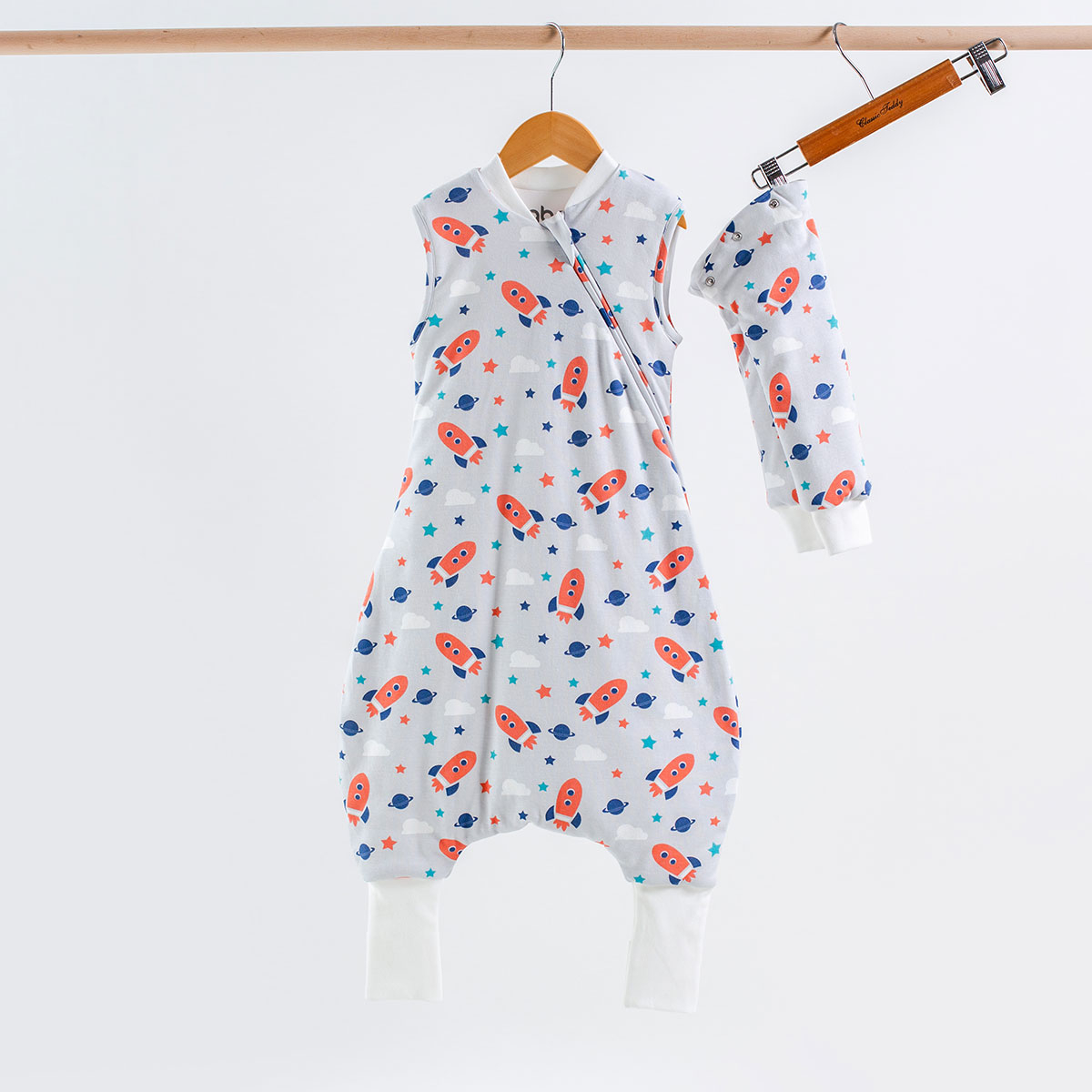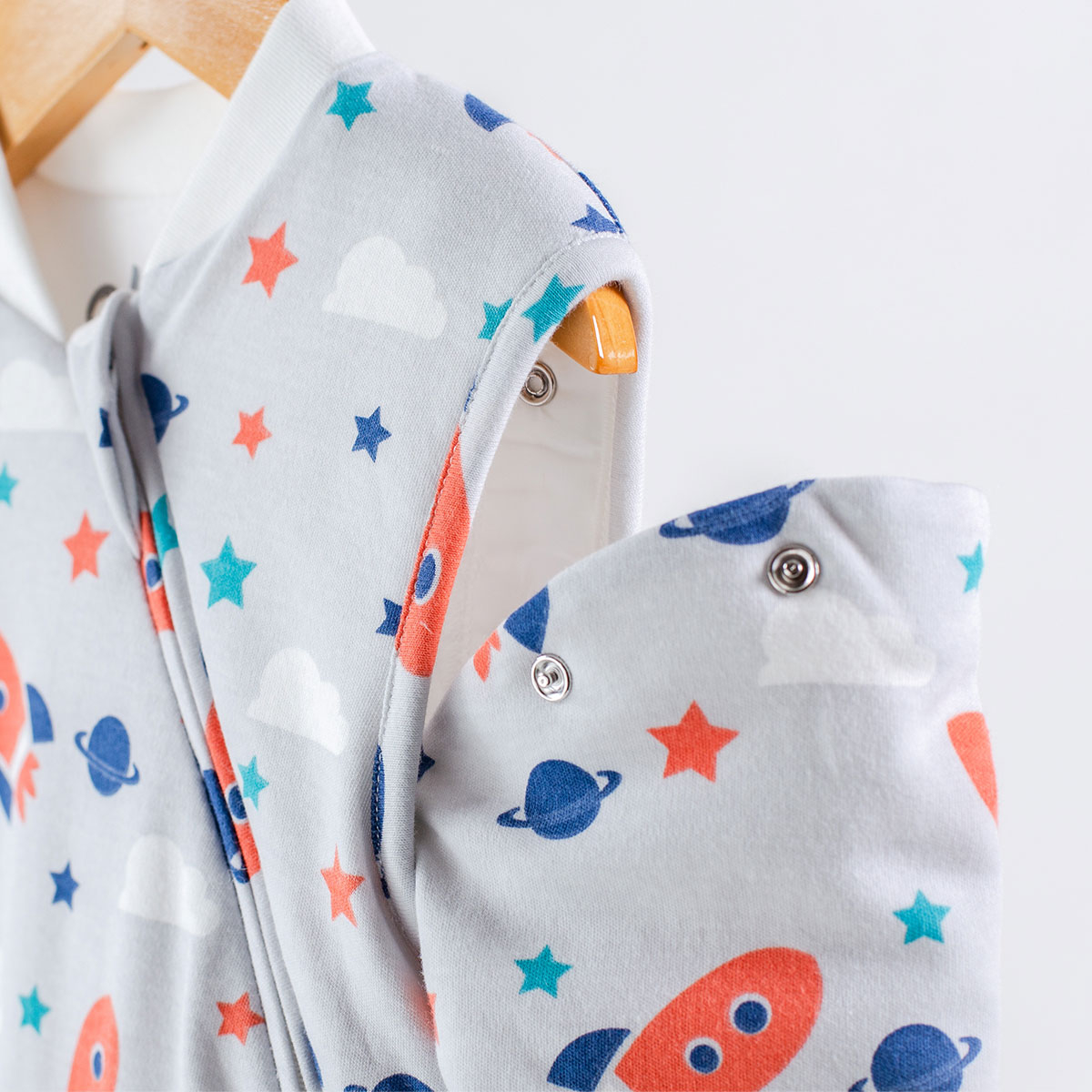 Βρεφικός υπνόσακος από την εταιρεία Abo σε γκρι χρώμα με πύραυλους στο σχέδιο. Η εξωτερική επένδυση είναι ύφασμα από 100% βαμβάκι. Η γέμισή του είναι από πολυεστερική βάτα. Έχει δείκτη θερμότητας 2,5 tog, που τον καθιστά ιδανικό για δωμάτια με θερμοκρασία 16-20 βαθμούς Κελσίου. Έχει αποσπώμενα μανίκια με μικρό και λεπτό κούμπωμα στο μπράτσο. Διαθέτει φερμουάρ διπλής κατεύθυνσης και αναδιπλούμενα πατουσάκια με αντιολισθητική επένδυση. Οι ραφές, τα φερμουάρ και τα κουμπιά είναι σχεδιασμένα να βρίσκονται στο εσωτερικό ύφασμα κρυμμένα, ώστε να μην αγγίζουν το δέρμα του μωρού. Φοριέται σαν ρουχαλάκι, χαρίζοντάς του ελευθερία κινήσεων, επιτρέποντάς του να σηκώνεται και να περπατά. Ο υπνόσακος εξασφαλίζει σταθερή θερμοκρασία σώματος, ελαχιστοποιώντας έτσι την πιθανότητα να κρυώσει ή να υπερθερμανθεί το μωρό.