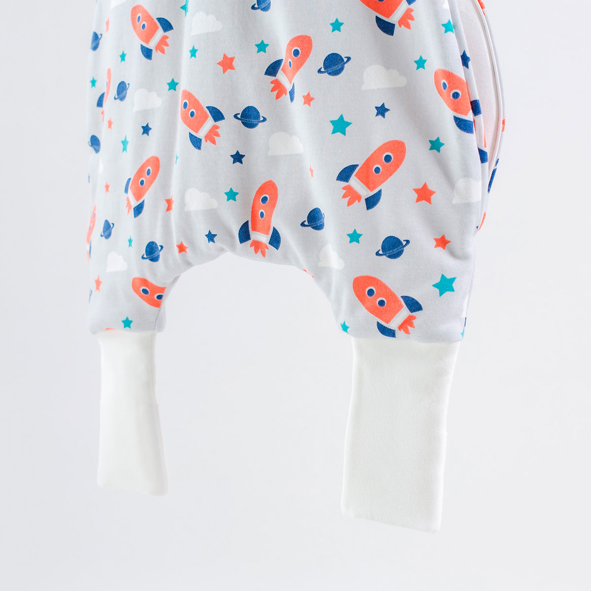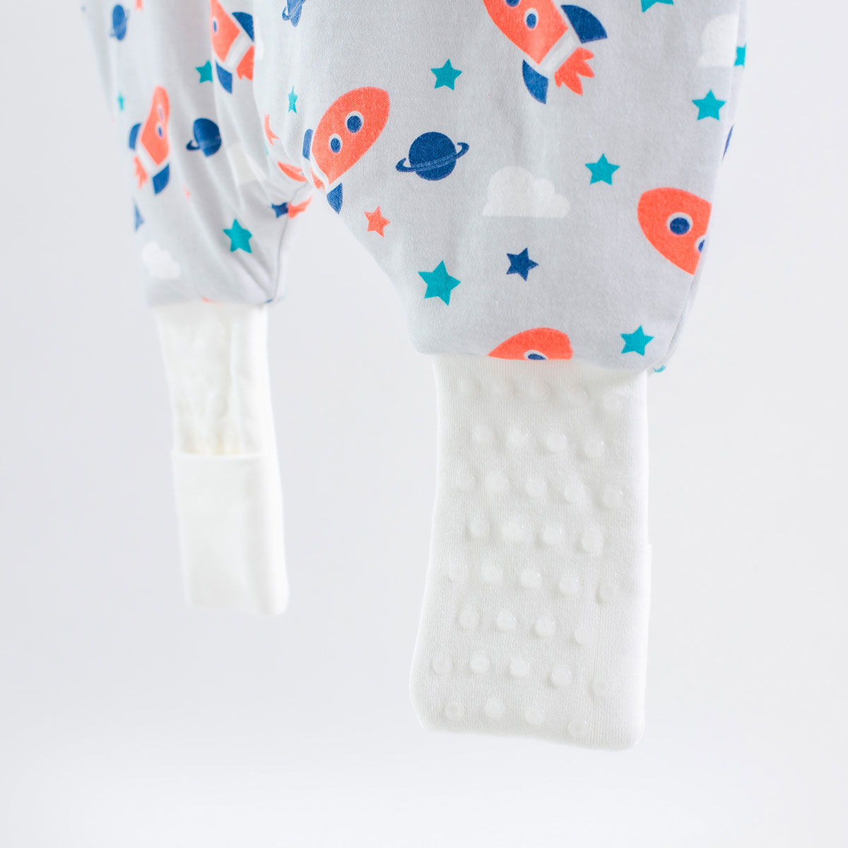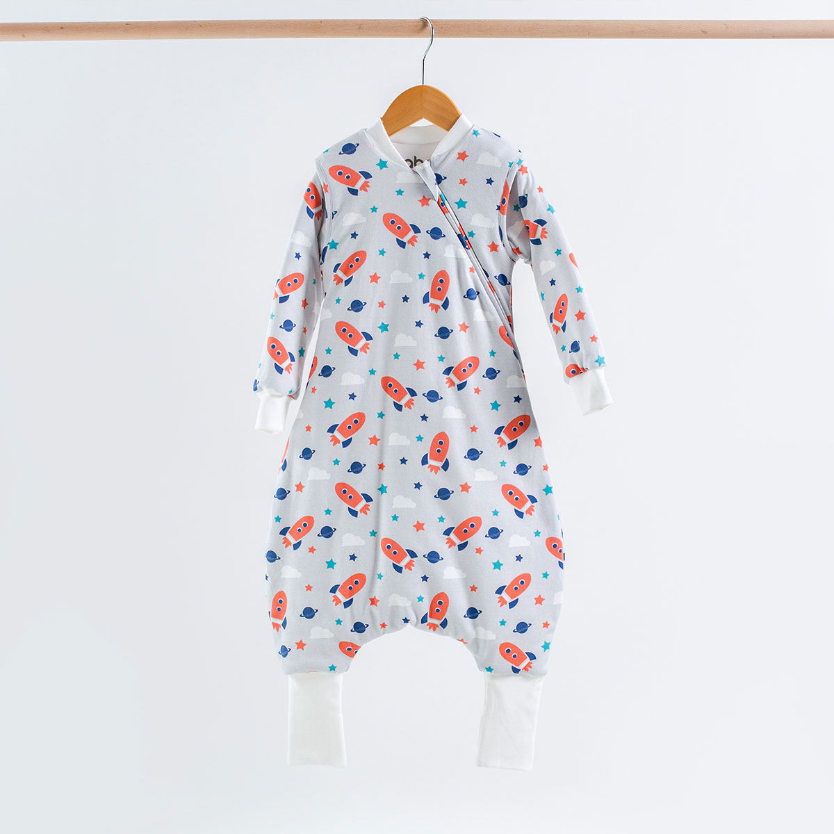 Βρεφικός υπνόσακος από την εταιρεία Abo σε γκρι χρώμα με πύραυλους στο σχέδιο. Η εξωτερική επένδυση είναι ύφασμα από 100% βαμβάκι. Η γέμισή του είναι από πολυεστερική βάτα. Έχει δείκτη θερμότητας 2,5 tog, που τον καθιστά ιδανικό για δωμάτια με θερμοκρασία 16-20 βαθμούς Κελσίου. Έχει αποσπώμενα μανίκια με μικρό και λεπτό κούμπωμα στο μπράτσο. Διαθέτει φερμουάρ διπλής κατεύθυνσης και αναδιπλούμενα πατουσάκια με αντιολισθητική επένδυση. Οι ραφές, τα φερμουάρ και τα κουμπιά είναι σχεδιασμένα να βρίσκονται στο εσωτερικό ύφασμα κρυμμένα, ώστε να μην αγγίζουν το δέρμα του μωρού. Φοριέται σαν ρουχαλάκι, χαρίζοντάς του ελευθερία κινήσεων, επιτρέποντάς του να σηκώνεται και να περπατά. Ο υπνόσακος εξασφαλίζει σταθερή θερμοκρασία σώματος, ελαχιστοποιώντας έτσι την πιθανότητα να κρυώσει ή να υπερθερμανθεί το μωρό.