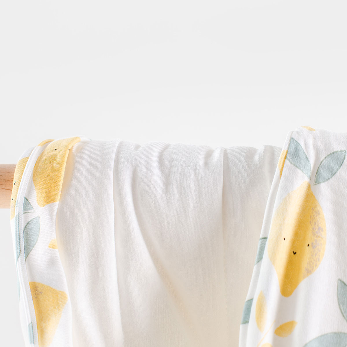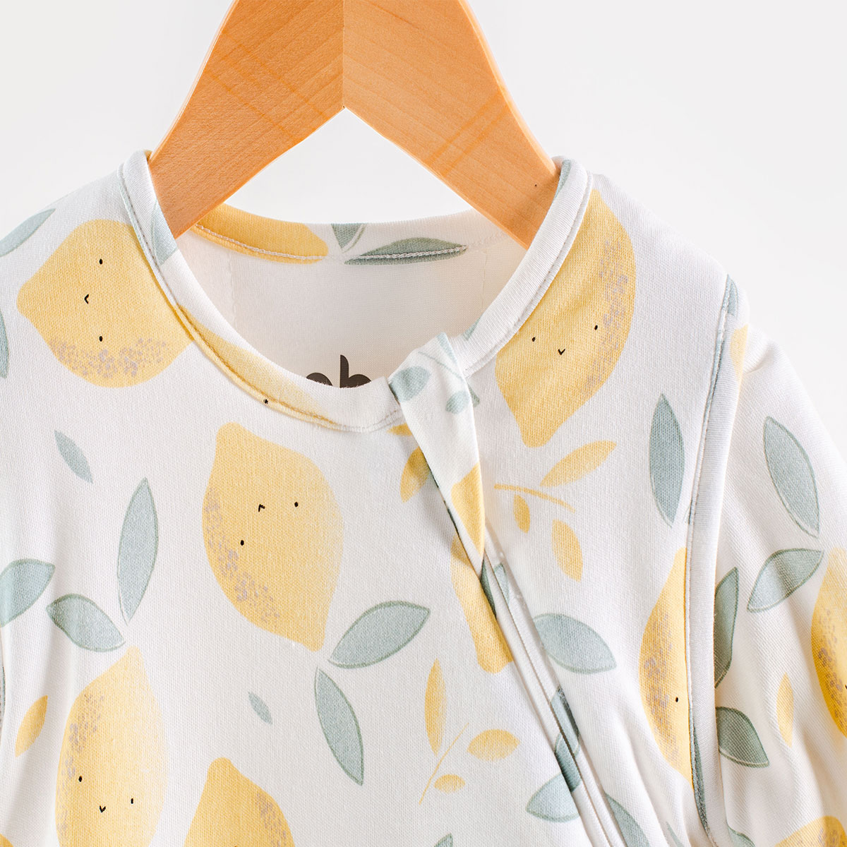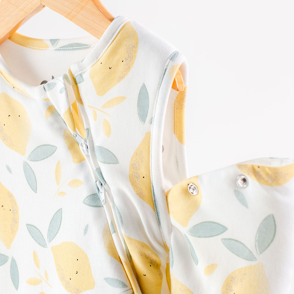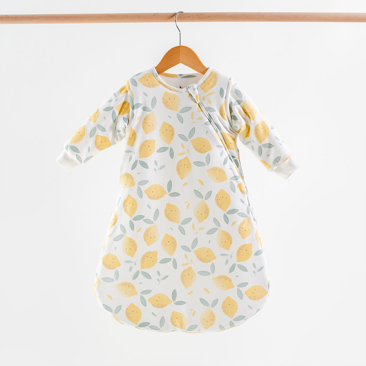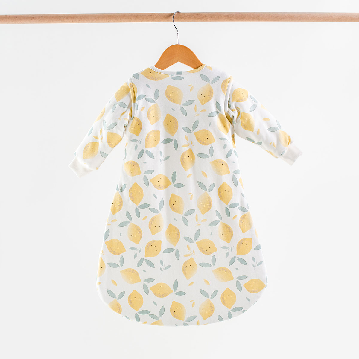 Βρεφικός υπνόσακος από την εταιρεία Abo σε λευκό φόντο με κίτρινα λεμονάκια στο σχέδιο. Η εξωτερική επένδυση είναι ύφασμα από 100% βαμβάκι. Η γέμισή του είναι από πολυεστερική βάτα. Έχει δείκτη θερμότητας 2,5 tog, που τον καθιστά ιδανικό για δωμάτια με θερμοκρασία 16-20 βαθμούς Κελσίου. Έχει αποσπώμενα μανίκια με μικρό και λεπτό κούμπωμα στο μπράτσο. Διαθέτει φερμουάρ διπλής κατεύθυνσης με άνοιγμα στο πάνω αλλά και στο κάτω μέρος για εύκολη αλλαγή πάνας. Οι ραφές, τα φερμουάρ και τα κουμπιά είναι σχεδιασμένα να βρίσκονται στο εσωτερικό ύφασμα κρυμμένα, ώστε να μην αγγίζουν το δέρμα του μωρού. Φοριέται σαν ρουχαλάκι, χαρίζοντάς του ελευθερία κινήσεων. Ο υπνόσακος εξασφαλίζει σταθερή θερμοκρασία σώματος, ελαχιστοποιώντας έτσι την πιθανότητα να κρυώσει ή να υπερθερμανθεί το μωρό.