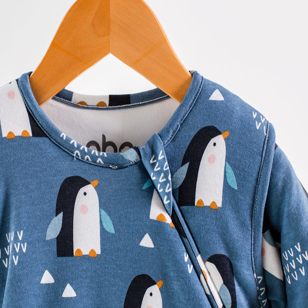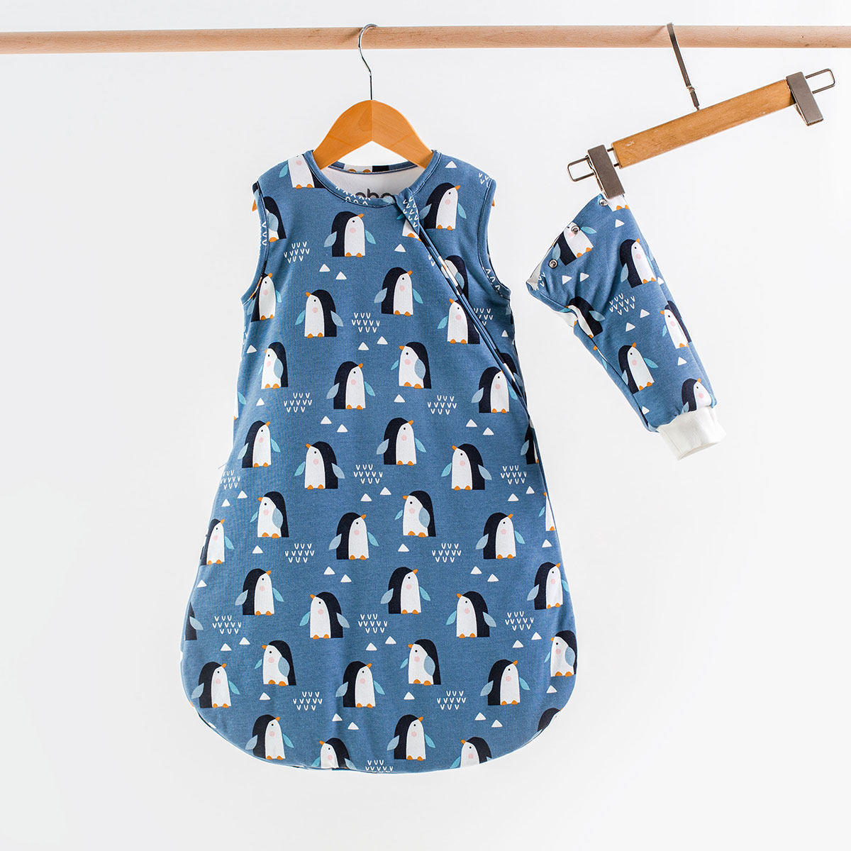 Βρεφικός υπνόσακος από την εταιρεία Abo σε μπλε χρώμα με πιγκουινάκια στο σχέδιο. Η εξωτερική επένδυση είναι ύφασμα από 100% βαμβάκι. Η γέμισή του είναι από πολυεστερική βάτα. Έχει δείκτη θερμότητας 2,5 tog, που τον καθιστά ιδανικό για δωμάτια με θερμοκρασία 16-20 βαθμούς Κελσίου. Έχει αποσπώμενα μανίκια με μικρό και λεπτό κούμπωμα στο μπράτσο. Διαθέτει φερμουάρ διπλής κατεύθυνσης με άνοιγμα στο πάνω αλλά και στο κάτω μέρος για εύκολη αλλαγή πάνας. Οι ραφές, τα φερμουάρ και τα κουμπιά είναι σχεδιασμένα να βρίσκονται στο εσωτερικό ύφασμα κρυμμένα, ώστε να μην αγγίζουν το δέρμα του μωρού. Φοριέται σαν ρουχαλάκι, χαρίζοντάς του ελευθερία κινήσεων. Ο υπνόσακος εξασφαλίζει σταθερή θερμοκρασία σώματος, ελαχιστοποιώντας έτσι την πιθανότητα να κρυώσει ή να υπερθερμανθεί το μωρό.