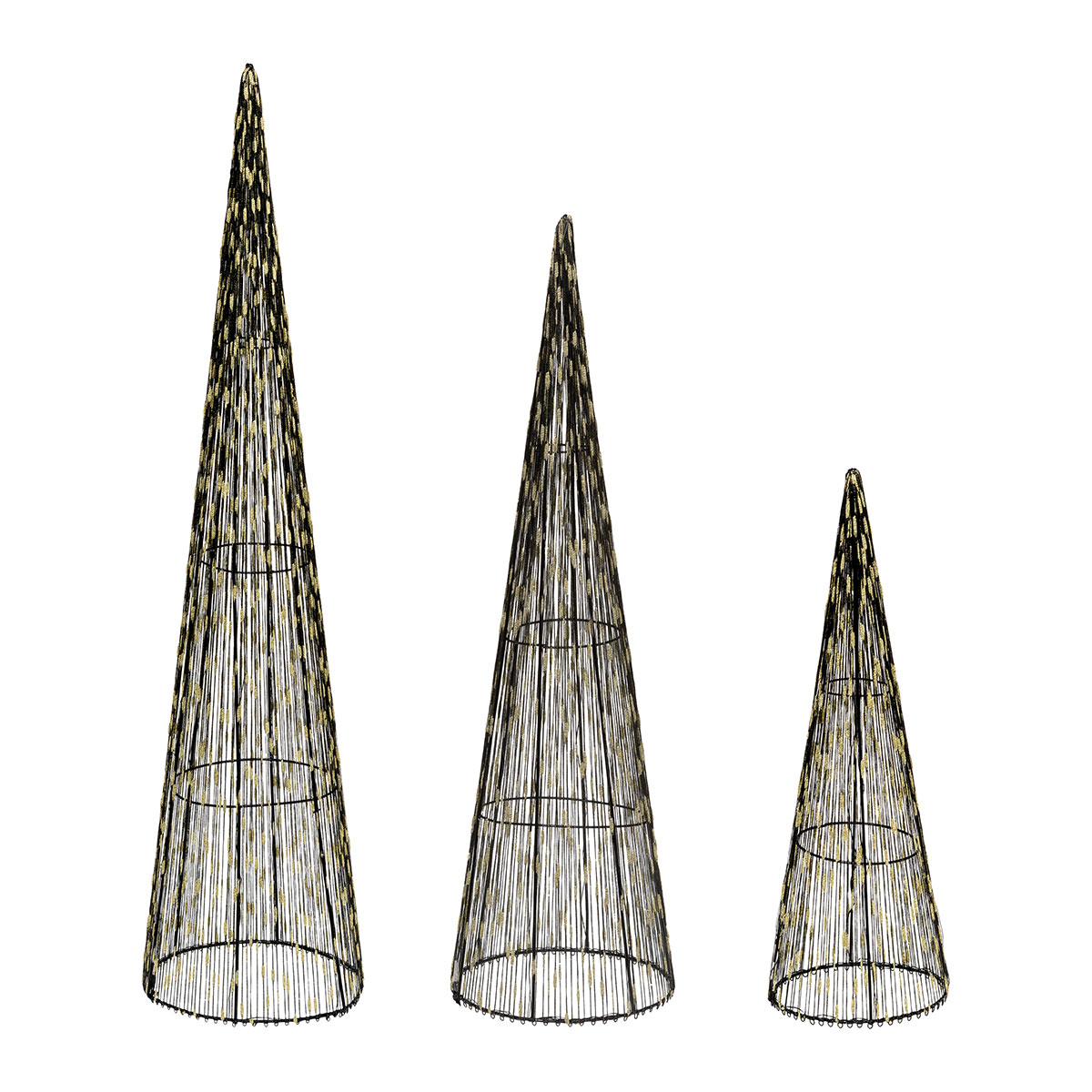 Χριστουγεννιάτικα δεντράκια με μεταλλικό σκελετό. Διαθέτουν λαμπάκια led με θερμό λευκό φως και λειτουργούν με μπαταρίες AA LR6 (δεν περιλαμβάνονται). Ιδανικά για να στολίσουν οποιονδήποτε εσωτερικό χώρο και να δώσουν λάμψη και εορταστική όψη.