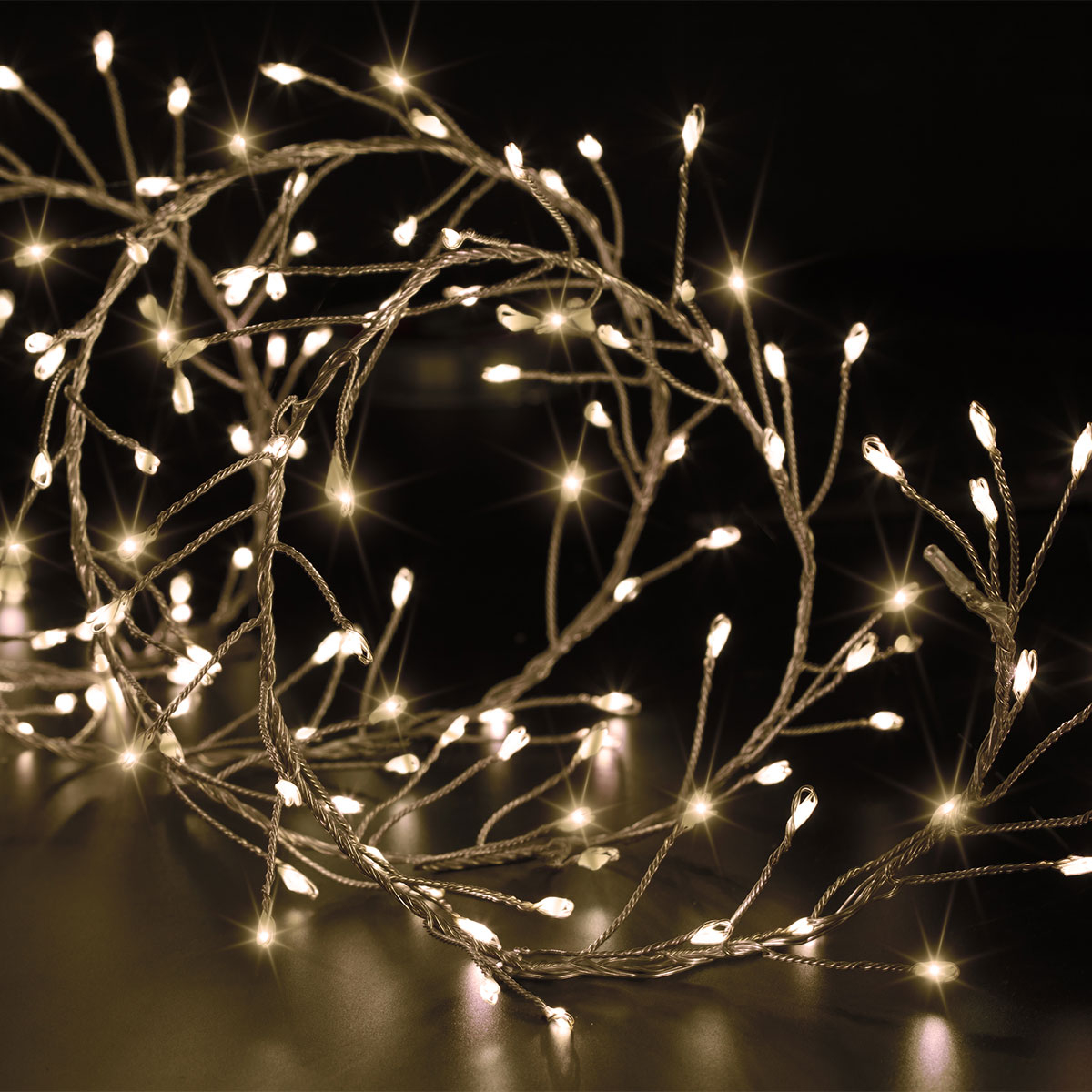 200 χριστουγεννιάτικα Led λαμπάκια με θερμό λευκό φως σε σειρά και ασημί καλώδιο από χαλκό. Διαθέτουν 8 προγράμματα λειτουργίας και είναι κατάλληλα για εσωτερικό και εξωτερικό χώρο.