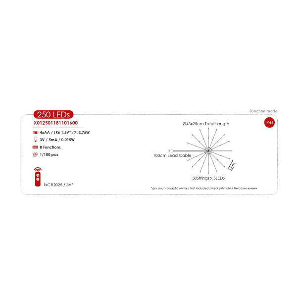 250 χριστουγεννιάτικα λαμπάκια Led τύπου πυροτέχνημα από την εταιρεία Aca Decor με 8 προγράμματα λειτουργίας. Αποτελείται από 50 σειρές με 5 λαμπάκια η κάθε μία και συνολική διάμετρο 43εκ. Το καλώδιο είναι ασημί, κατασκευασμένο από χαλκό. Έχουν επιπλέον 100εκ. καλώδιο και τηλεχειριστήριο. Η απόσταση μεταξύ των σειρών είναι 5εκ. Έχουν βαθμό στεγανότητας IP44 που τα καθιστά κατάλληλα και για εξωτερικούς χώρους. Διαθέτουν ενσωματωμένες πλακέτες Led συνολικής ισχύος 3.75Watt, θερμού λευκού φωτός. Λειτουργούν με 4 μπαταρίες ΑΑ (δεν περιλαμβάνονται).