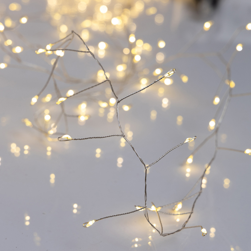 480 mini χριστουγεννιάτικα λαμπάκια Led τύπου cluster με σταθερό θερμό λευκό φωτισμό της εταιρείας Eurolamp. Έχουν βαθμό στεγανότητας IP44 που τα καθιστά κατάλληλα για εσωτερικούς και για εξωτερικούς χώρους. Το καλώδιο είναι κατασκευασμένο από χαλκό σε ασημί χρώμα. Τα λαμπάκια έχουν απόσταση μεταξύ τους 3.3εκ. Το συνολικό μήκος είναι 9.4 μέτρα εκ των οποίων τα 5 μέτρα είναι καλώδιο επέκτασης με αντάπτορα. Διαθέτει ενσωματωμένες πλακέτες Led συνολικής ισχύος 6Watt, θερμού λευκού φωτός (2200K-2300Κ).