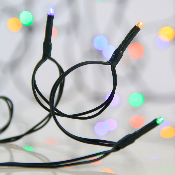 100 χριστουγεννιάτικα λαμπάκια Led με πολύχρωμο φωτισμό από την εταιρεία Eurolamp. Έχουν βαθμό στεγανότητας IP44 που τα καθιστά κατάλληλα και για εξωτερικούς χώρους. Το καλώδιο είναι κατασκευασμένο από PVC σε πράσινο χρώμα. Τα λαμπάκια έχουν μέγεθος 0.3εκ. έκαστος και έχουν απόσταση μεταξύ τους 10εκ. Το συνολικό μήκος είναι 13.1 μέτρα εκ των οποίων τα 3 μέτρα είναι καλώδιο επέκτασης με αντάπτορα. Έχουν τη δυνατότητα επέκτασης με έως 3 καλώδια ίδιου τύπου. Διαθέτει ενσωματωμένες πλακέτες Led συνολικής ισχύος 3.6Watt.