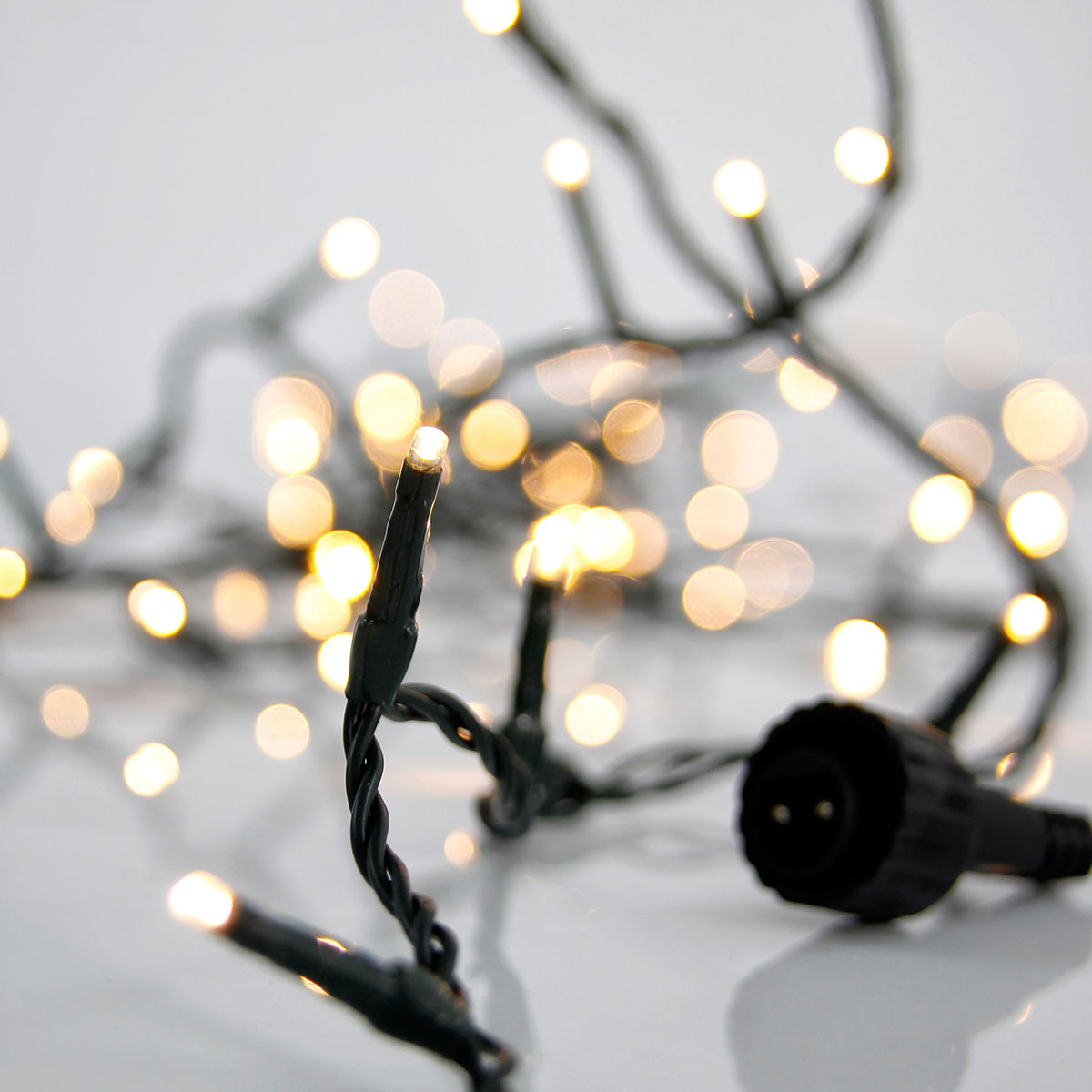100 χριστουγεννιάτικα λαμπάκια Led με θερμό λευκό φωτισμό από την εταιρεία Eurolamp. Έχουν βαθμό στεγανότητας IP44 που τα καθιστά κατάλληλα και για εξωτερικούς χώρους. Το καλώδιο είναι κατασκευασμένο από πλαστικό υλικό σε πράσινο χρώμα. Τα λαμπάκια έχουν μέγεθος 0.3εκ. έκαστος και έχουν απόσταση μεταξύ τους 5εκ. Το συνολικό μήκος είναι 8.1 μέτρα εκ των οποίων τα 3 μέτρα είναι καλώδιο επέκτασης με αντάπτορα. Έχει τη δυνατότητα επέκτασης με έως 3 καλώδια ίδιου τύπου. Διαθέτει ενσωματωμένες πλακέτες Led συνολικής ισχύος 3.6Watt, λευκού θερμού φωτός (2300K).