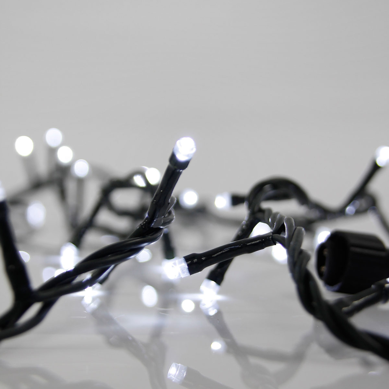 100 χριστουγεννιάτικα λαμπάκια Led με ψυχρό λευκό φωτισμό από την εταιρεία Eurolamp. Έχουν βαθμό στεγανότητας IP44 που τα καθιστά κατάλληλα και για εξωτερικούς χώρους. Το καλώδιο είναι κατασκευασμένο από πλαστικό υλικό σε πράσινο χρώμα. Τα λαμπάκια έχουν μέγεθος 0.3εκ. έκαστος και έχουν απόσταση μεταξύ τους 10εκ. Το συνολικό μήκος είναι 13.1 μέτρα εκ των οποίων τα 3 μέτρα είναι καλώδιο επέκτασης με αντάπτορα. Έχει τη δυνατότητα επέκτασης με έως 3 καλώδια ίδιου τύπου. Διαθέτει ενσωματωμένες πλακέτες Led συνολικής ισχύος 3.6Watt, λευκού ψυχρού φωτός (8500K).