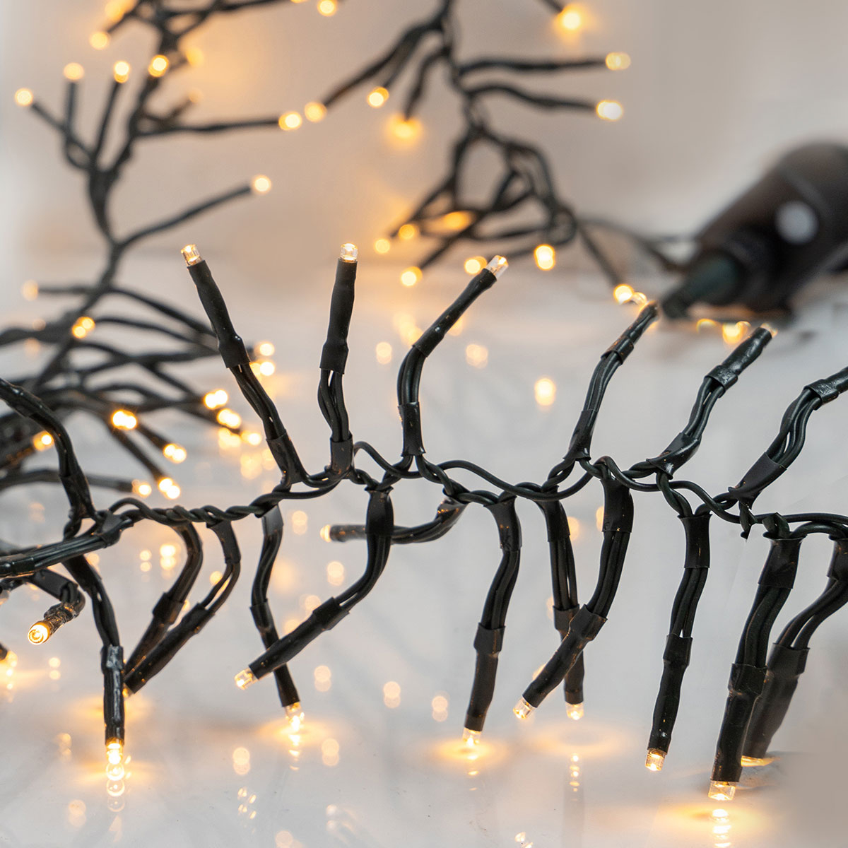 144 χριστουγεννιάτικα λαμπάκια Led τύπου cluster με θερμό λευκό φωτισμό από την εταιρεία Eurolamp. Έχουν βαθμό στεγανότητας IP44 που τα καθιστά κατάλληλα και για εξωτερικούς χώρους. Το καλώδιο είναι κατασκευασμένο από PVC σε πράσινο χρώμα. Έχει 8 προγράμματα φωτισμού και μετασχηματιστή με μνήμη για να απομνημονεύει το πρόγραμμα που χρησιμοποιήσατε την τελευταία φορά. Τα λαμπάκια έχουν μέγεθος 0.3εκ. έκαστος και έχουν απόσταση μεταξύ τους 5εκ. Το συνολικό μήκος είναι 4.3 μέτρα εκ των οποίων τα 3 μέτρα είναι καλώδιο επέκτασης με αντάπτορα. Διαθέτει ενσωματωμένες πλακέτες Led συνολικής ισχύος 3.6Watt, λευκού θερμού φωτός (2200Κ-2300K).