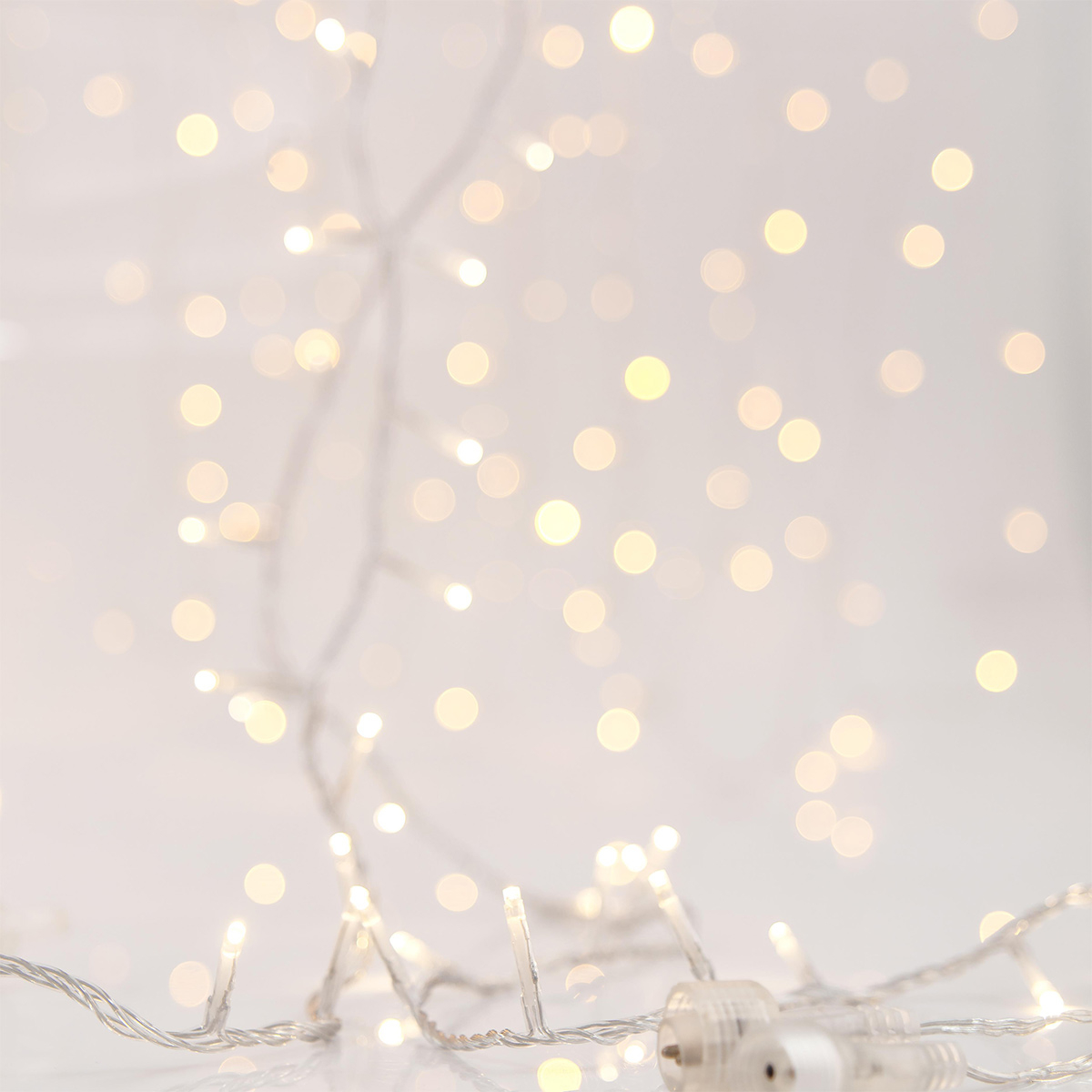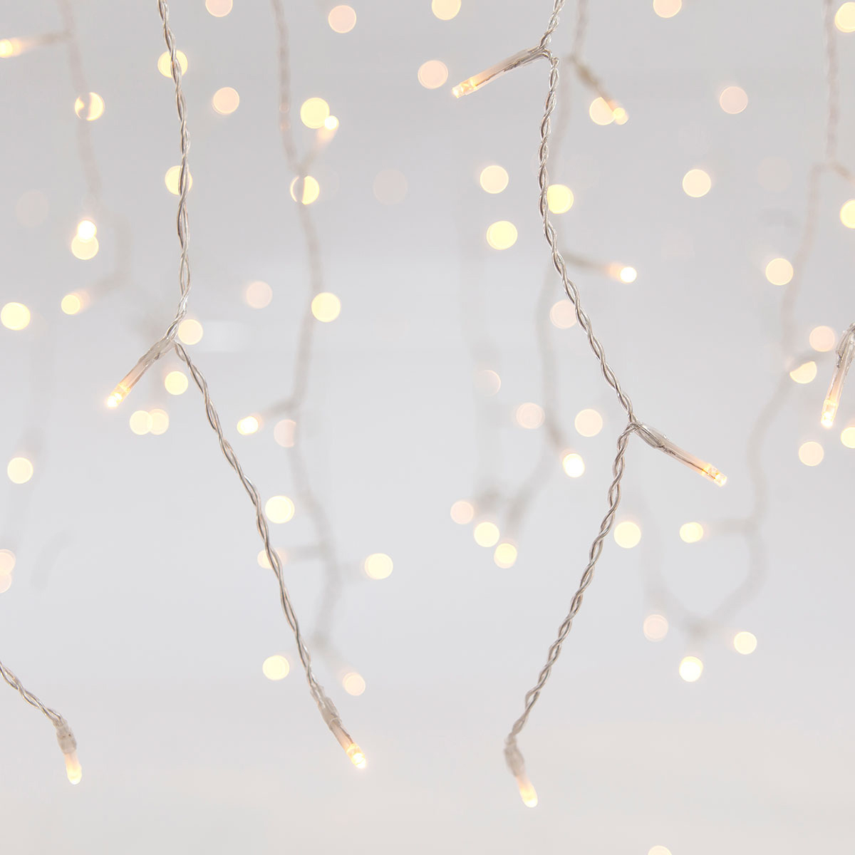 240 χριστουγεννιάτικα λαμπάκια Led τύπου βροχή από την εταιρεία Eurolamp με σταθερό φωτισμό. Αποτελείται από 20 σειρές με 12 λαμπάκια στην κάθε σειρά. Το καλώδιο είναι κατασκευασμένο από PVC σε διάφανο χρώμα. Έχουν μήκος 2 μέτρα και επιπλέον 3 μέτρα καλώδιο επέκτασης με αντάπτορα. Η απόσταση μεταξύ των λαμπτήρων είναι 10εκ. Έχουν βαθμό στεγανότητας IP44 που τα καθιστά κατάλληλα και για εξωτερικούς χώρους. Έχει τη δυνατότητα επέκτασης με έως 3 καλώδια ίδιου τύπου. Διαθέτουν ενσωματωμένες πλακέτες Led συνολικής ισχύος 7.2Watt, θερμού λευκού φωτός (2200K-2300K).