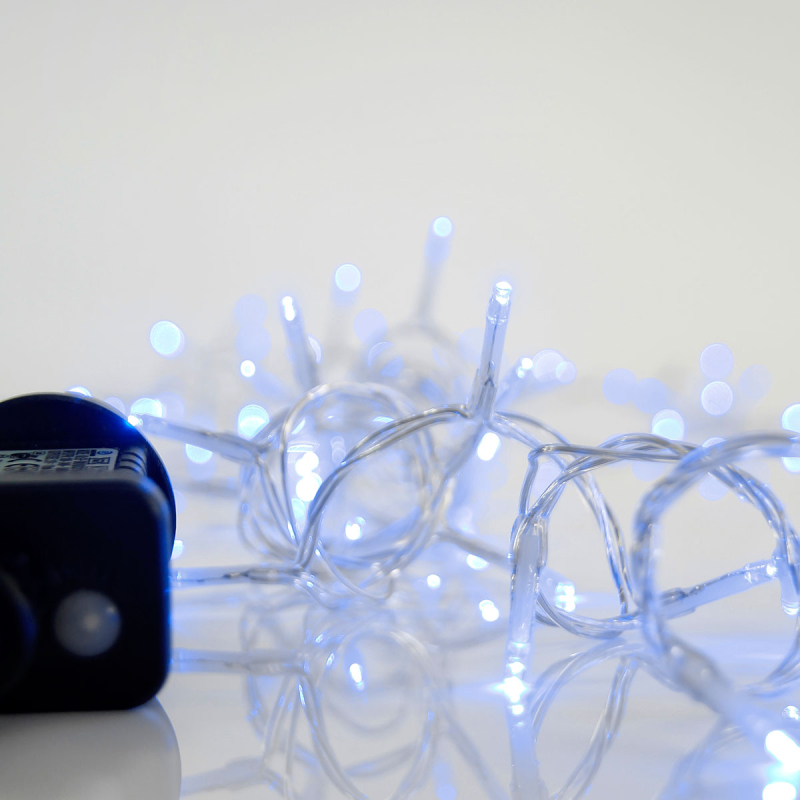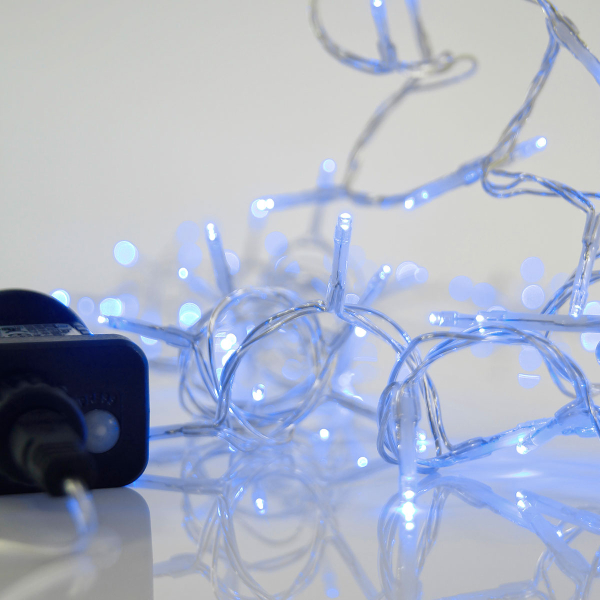 240 χριστουγεννιάτικα λαμπάκια Led με μπλε φωτισμό από την εταιρεία Eurolamp. Έχουν βαθμό στεγανότητας IP44 που τα καθιστά κατάλληλα και για εξωτερικούς χώρους. Το καλώδιο είναι κατασκευασμένο από PVC σε διάφανο χρώμα. Έχει 8 προγράμματα φωτισμού και μετασχηματιστή με μνήμη για να απομνημονεύει το πρόγραμμα που χρησιμοποιήσατε την τελευταία φορά. Τα λαμπάκια έχουν μέγεθος 0.3εκ. έκαστος και έχουν απόσταση μεταξύ τους 5εκ. Το συνολικό μήκος είναι 14.9 μέτρα εκ των οποίων τα 3 μέτρα είναι καλώδιο επέκτασης με αντάπτορα. Διαθέτει ενσωματωμένες πλακέτες Led συνολικής ισχύος 3.6Watt.