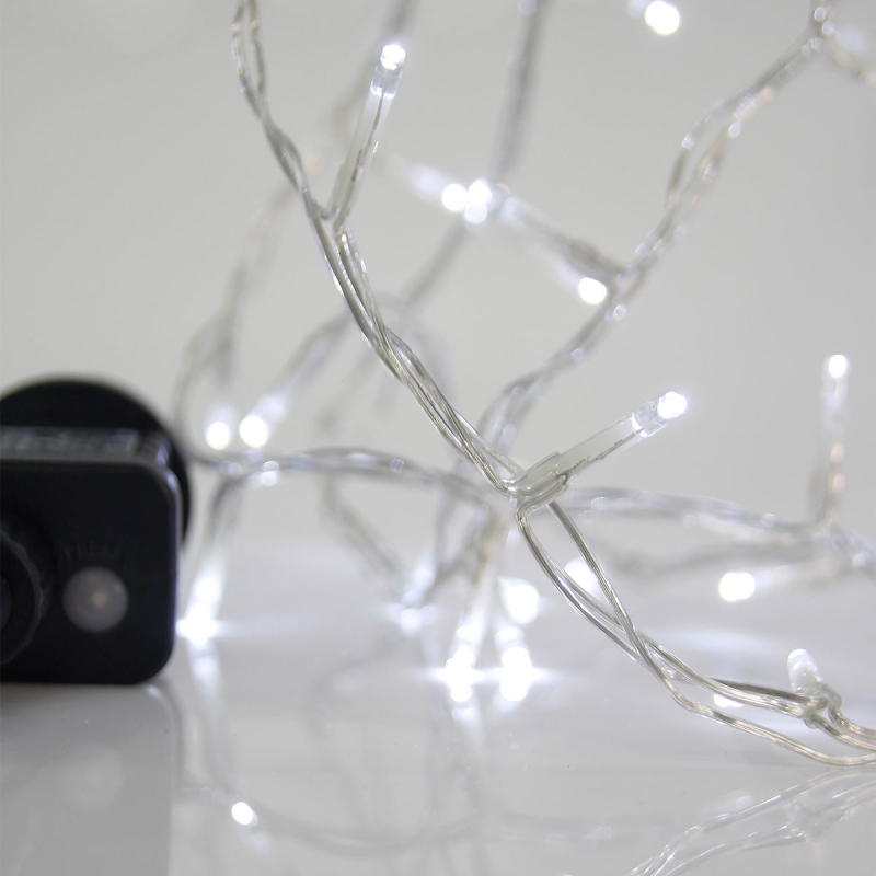 240 χριστουγεννιάτικα λαμπάκια Led με ψυχρό λευκό φωτισμό από την εταιρεία Eurolamp. Έχουν βαθμό στεγανότητας IP44 που τα καθιστά κατάλληλα και για εξωτερικούς χώρους. Το καλώδιο είναι κατασκευασμένο από PVC σε διάφανο χρώμα. Έχει 8 προγράμματα φωτισμού και μετασχηματιστή με μνήμη για να απομνημονεύει το πρόγραμμα που χρησιμοποιήσατε την τελευταία φορά. Τα λαμπάκια έχουν μέγεθος 0.3εκ. έκαστος και έχουν απόσταση μεταξύ τους 5εκ. Το συνολικό μήκος είναι 14.9 μέτρα εκ των οποίων τα 3 μέτρα είναι καλώδιο επέκτασης με αντάπτορα. Διαθέτει ενσωματωμένες πλακέτες Led συνολικής ισχύος 3.6Watt, ψυχρού λευκού φωτός (7500Κ-8500K).