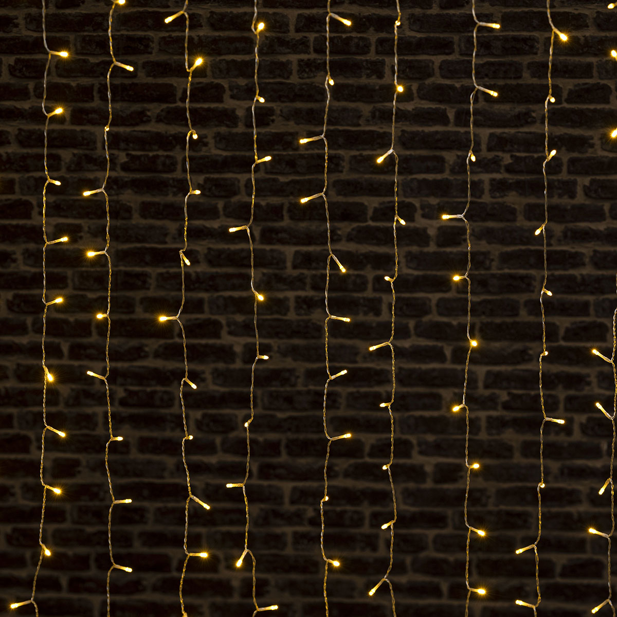300 χριστουγεννιάτικα λαμπάκια Led τύπου κουρτίνα με θερμό λευκό φωτισμό και διάφανο καλώδιο. Αποτελούνται από 15 κάθετες σειρές από λαμπάκια με ύψος 2.5μ και απόσταση μεταξύ τους 10εκ. Διαθέτουν 8 προγράμματα και χρονοδιακόπτη. Πατώντας το κουμπί για 3 δευτερόλεπτα μέχρι να γίνει πράσινο, ο χρονοδιακόπτης ενεργοποιείται για 8 ώρες. Είναι κατάλληλα για εσωτερικό και εξωτερικό χώρο.