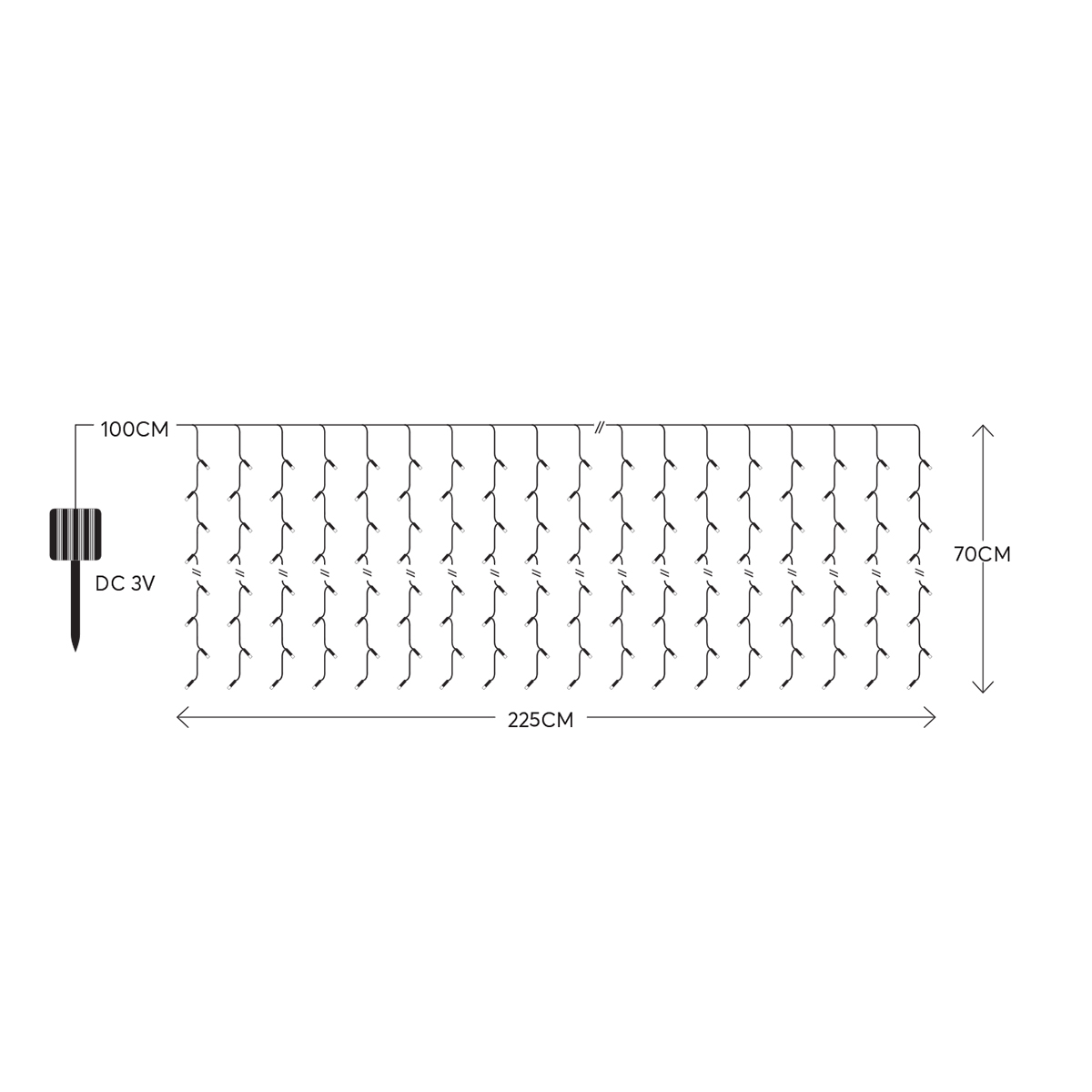 72 ηλιακά χριστουγεννιάτικα λαμπάκια Led τύπου βροχή με θερμό λευκό φωτισμό και πρόγραμμα από την εταιρεία Eurolamp. Έχουν βαθμό στεγανότητας IP44 που τα καθιστά κατάλληλα για εξωτερικούς χώρους. Το καλώδιο είναι κατασκευασμένο από διάφανο PVC υλικό. Τα λαμπάκια έχουν μέγεθος 0.5εκ. έκαστος και έχουν απόσταση μεταξύ τους 10εκ. Το συνολικό μήκος είναι 3.2 μέτρα εκ των οποίων το 1 μέτρο είναι καλώδιο επέκτασης και στο τέλος του καλωδίου έχει ηλιακό πάνελ. Διαθέτει ενσωματωμένες πλακέτες Led συνολικής ισχύος 0.5Watt, θερμού λευκού φωτός (2200Κ-2300K).