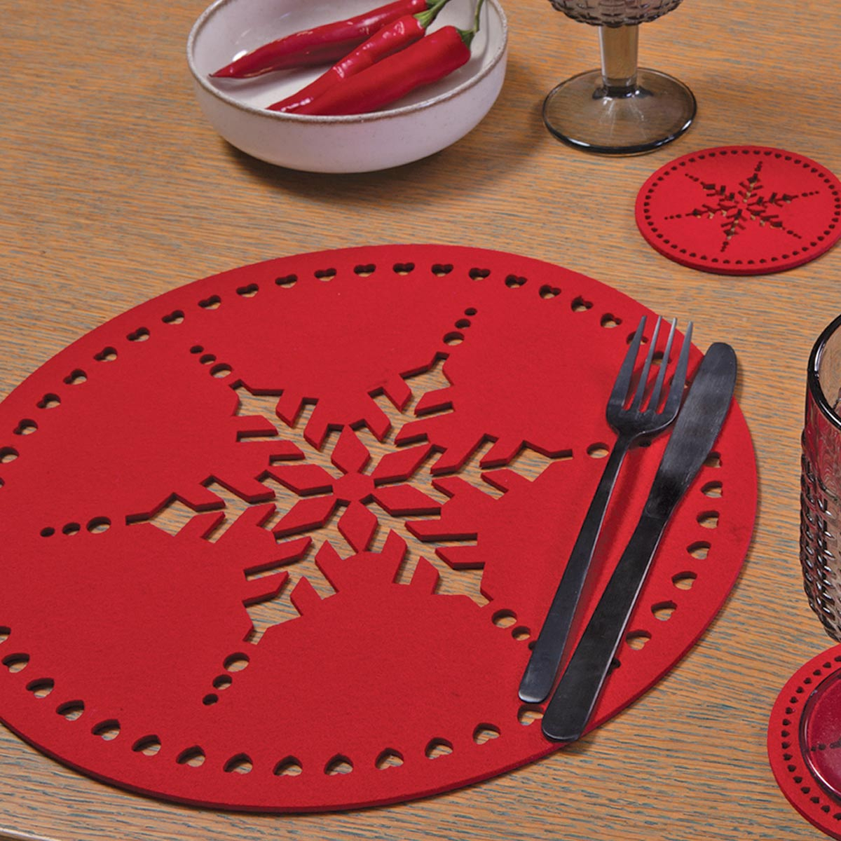 Χριστουγεννιάτικα σουπλά σε σετ 2 τεμαχίων από την εταιρεία Nef-Nef. Είναι κατασκευασμένα από τσόχα σύνθεσης 100% polyester σε κόκκινο χρώμα με στρογγυλό σχήμα και σχέδιο χιονονιφάδας. Ιδανικά για να δώσουν γιορτινό ύφος στο τραπέζι σας. Συνδυάστε τα με τα υπόλοιπα προϊόντα της συλλογής για ένα ολοκληρωμένο αποτέλεσμα.
