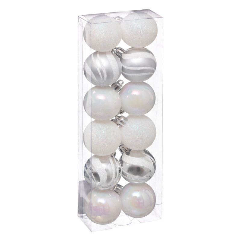 Χριστουγεννιάτικα στολίδια σετ 12 τεμαχίων σε ασημί και λευκό χρώμα, με λεπτομέρειες γκλίτερ και κατασκευασμένα από πλαστικό υλικό. Συνδυάστε διαφορετικά σετ με στολίδια για μία μοναδική γιορτινή διακόσμηση του δέντρου σας.