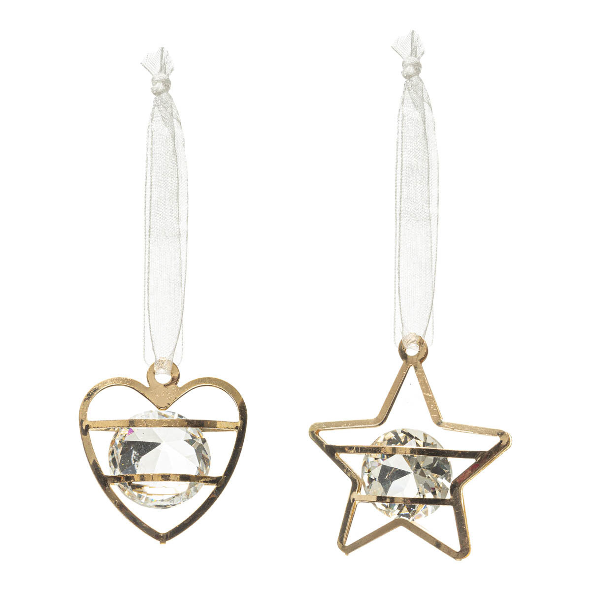 Χριστουγεννιάτικα στολίδια σετ 2 τεμαχίων σε χρυσό χρώμα. Είναι μεταλλικά σε σχήμα καρδιά και αστέρι. Συνδυάστε διαφορετικά σετ με στολίδια για μία μοναδική γιορτινή διακόσμηση του δέντρου σας.