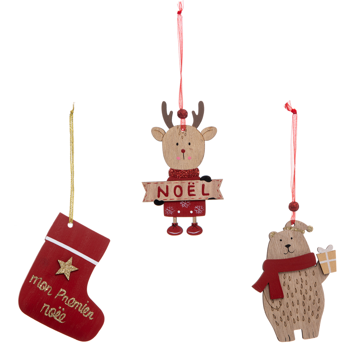 Στολίδια με χριστουγεννιάτικες φιγούρες για τις πρώτες γιορτές με το μωρό σας. Κατασκευασμένα από ξύλο σε φυσική-κόκκινη απόχρωση με λευκές λεπτομέρειες και γκλίτερ. Συνδυάστε διαφορετικά σετ με στολίδια για μία μοναδική γιορτινή διακόσμηση του δέντρου σας.