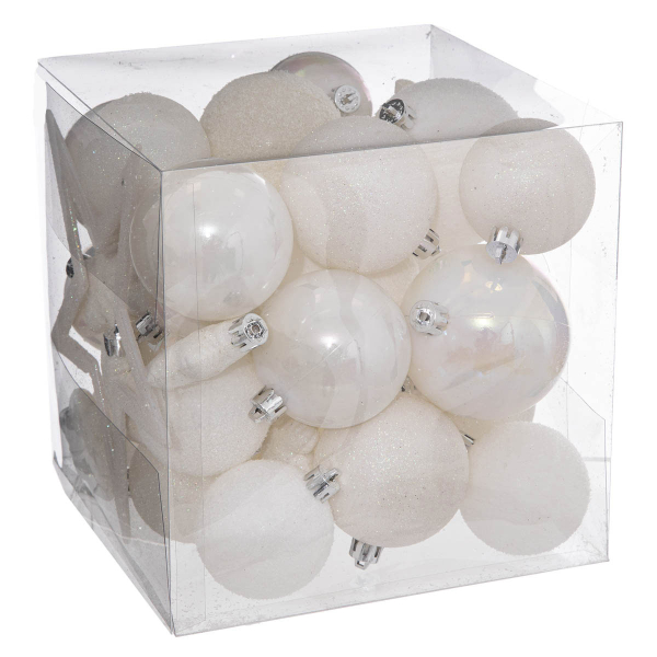 • Τεμάχια: 12 Μπάλες Φ6εκ., 8 Μπάλες Φ7εκ., 6 Μπάλες Φ8εκ., 8 Στολίδια Χιονονιφάδες, 1 Αστέρι 20x20