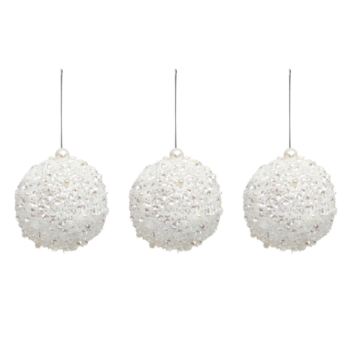 Χριστουγεννιάτικα στολίδια μπάλες σετ 3 τεμαχίων σε λευκό χρώμα με διακοσμητικές πέρλες. Είναι κατασκευασμένες από ανθεκτικό πλαστικό υλικό. Αναδείξτε τον στολισμό του χριστουγεννιάτικου δέντρου σας με στολίδια που εντυπωσιάζουν και ξεχωρίζουν.