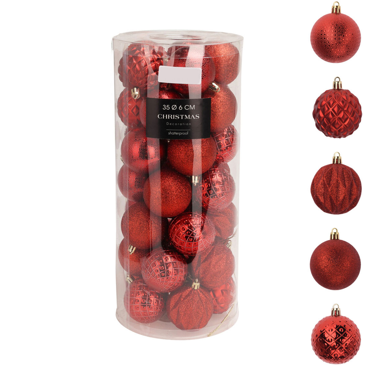 Χριστουγεννιάτικα στολίδια μπάλες σετ 35 τεμαχίων σε κόκκινο χρώμα. Έχουν διάμετρο 6εκ. και είναι κατασκευασμένες από πολυπροπυλένιο. Περιλαμβάνει μπάλες με glitter, ματ και με γυαλιστερό φινίρισμα. Ο συνδυασμός μεταξύ μεταλλικής λάμψης και ματ υφής αλλά και των διαφορετικών σχεδίων, προσφέρει ένα elegant αποτέλεσμα που συνδυάζεται άψογα με κάθε στυλ διακόσμησης. Αναμείξτε χρώματα, υφές και σχέδια από διαφορετικά σετ για ένα μοναδικό, εορταστικό αποτέλεσμα στο δέντρο σας.