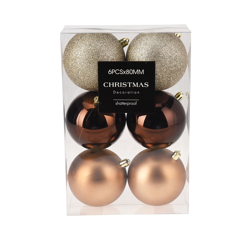 Χριστουγεννιάτικα στολίδια μπάλες σετ 6 τεμαχίων σε μπρονζέ και χρυσό χρώμα. Έχουν διάμετρο 8εκ. και είναι κατασκευασμένες από πολυπροπυλένιο. Περιλαμβάνει 2 μπάλες με χρυσόσκονη, 2 ματ μπρονζέ μπάλες και 2 μπρονζέ με γυαλιστερό φινίρισμα. Ο συνδυασμός μεταξύ μεταλλικής λάμψης και ματ υφής προσφέρει ένα elegant αποτέλεσμα που συνδυάζεται άψογα με κάθε στυλ διακόσμησης. Αναμείξτε χρώματα, υφές και σχέδια από διαφορετικά σετ για ένα μοναδικό, εορταστικό αποτέλεσμα στο δέντρο σας.