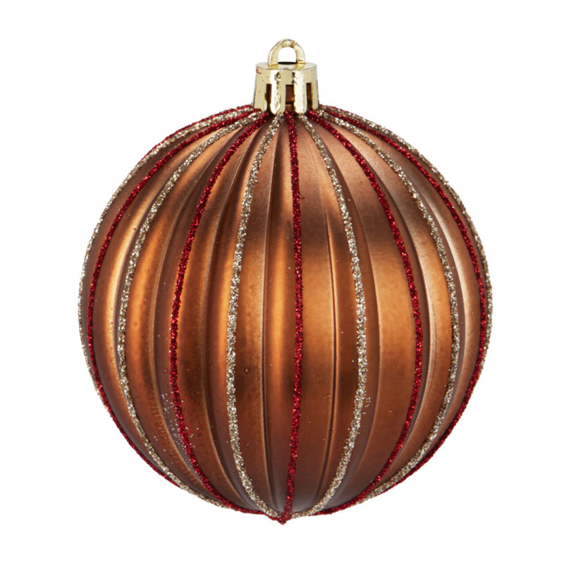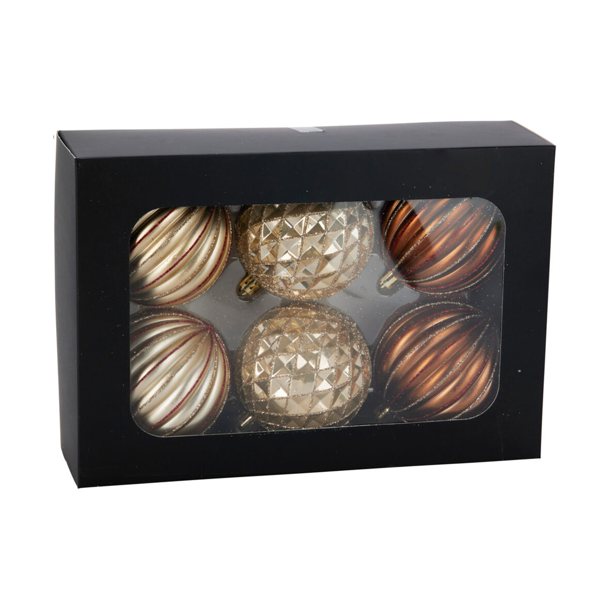 Χριστουγεννιάτικα στολίδια μπάλες σετ 6 τεμαχίων σε χρυσό και χάλκινο χρώμα. Έχουν διάμετρο 8εκ. και είναι κατασκευασμένες από πολυπροπυλένιο. Περιλαμβάνει 4 μπάλες με ανάγλυφες ραβδώσεις και χρυσόσκονη και 2 μπάλες με ανάγλυφο γεωμετρικό σχέδιο. Ένας ιδανικός συνδυασμός κομψότητας και εορταστικής διάθεσης για να ανανεώσετε τη χριστουγεννιάτικη διακόσμηση σας.