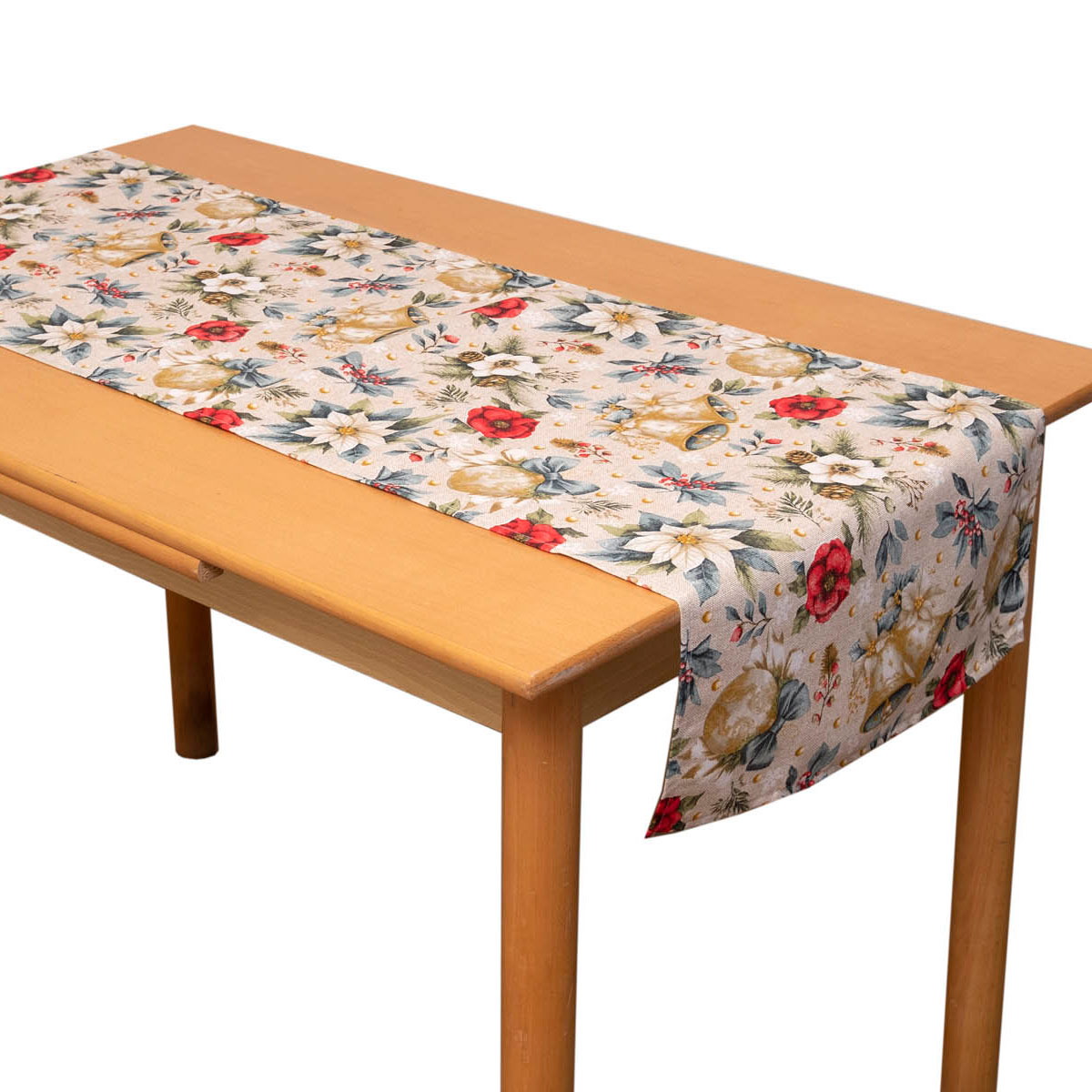 Χριστουγεννιάτικες τραβέρσες από την εταιρεία Viopros με μπεζ φόντο και κόκκινες-χρυσές-εκρού λεπτομέρειες. Το ύφασμά τους είναι λονέτα Ισπανίας, με σύνθεση 70% βαμβάκι - 30% polyester που τις καθιστά ανθεκτικές στη χρήση και τις πλύσεις. Συνδυάστε τες με τα υπόλοιπα προϊόντα της ίδιας σειράς για ένα ολοκληρωμένο, γιορτινό αποτέλεσμα.
