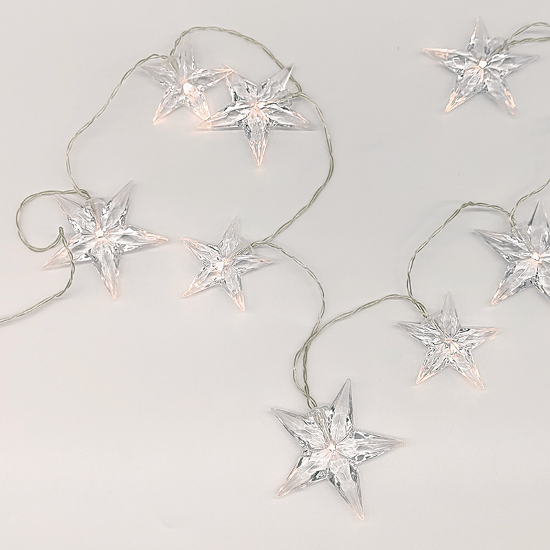 Διακοσμητική γιρλάντα με φωτάκια Led της εταιρείας Aca Decor. Είναι κατασκευασμένη από ακρυλικό υλικό και διαθέτει διάφανο καλώδιο. Έχει 10 Led λαμπάκια σε σχήμα αστεριού σε διάφανο χρώμα και είναι κατάλληλη να στολίσει χριστουγεννιάτικα όλους τους χώρους του σπιτιού. Λειτουργεί με 3 μπαταρίες AA LR6, οι οποίες δεν περιλαμβάνονται. Το συνολικό μήκους του καλωδίου είναι 165εκ. και διαθέτει στο τέλος του διακόπτη ON/OFF. Φέρει ενσωματωμένες πλακέτες Led συνολικής ισχύος 0.45Watt, λευκού θερμού φωτός (3000K). *Το φωτιστικό απεικονίζεται με αναμμένο φως ( θερμό λευκό).*