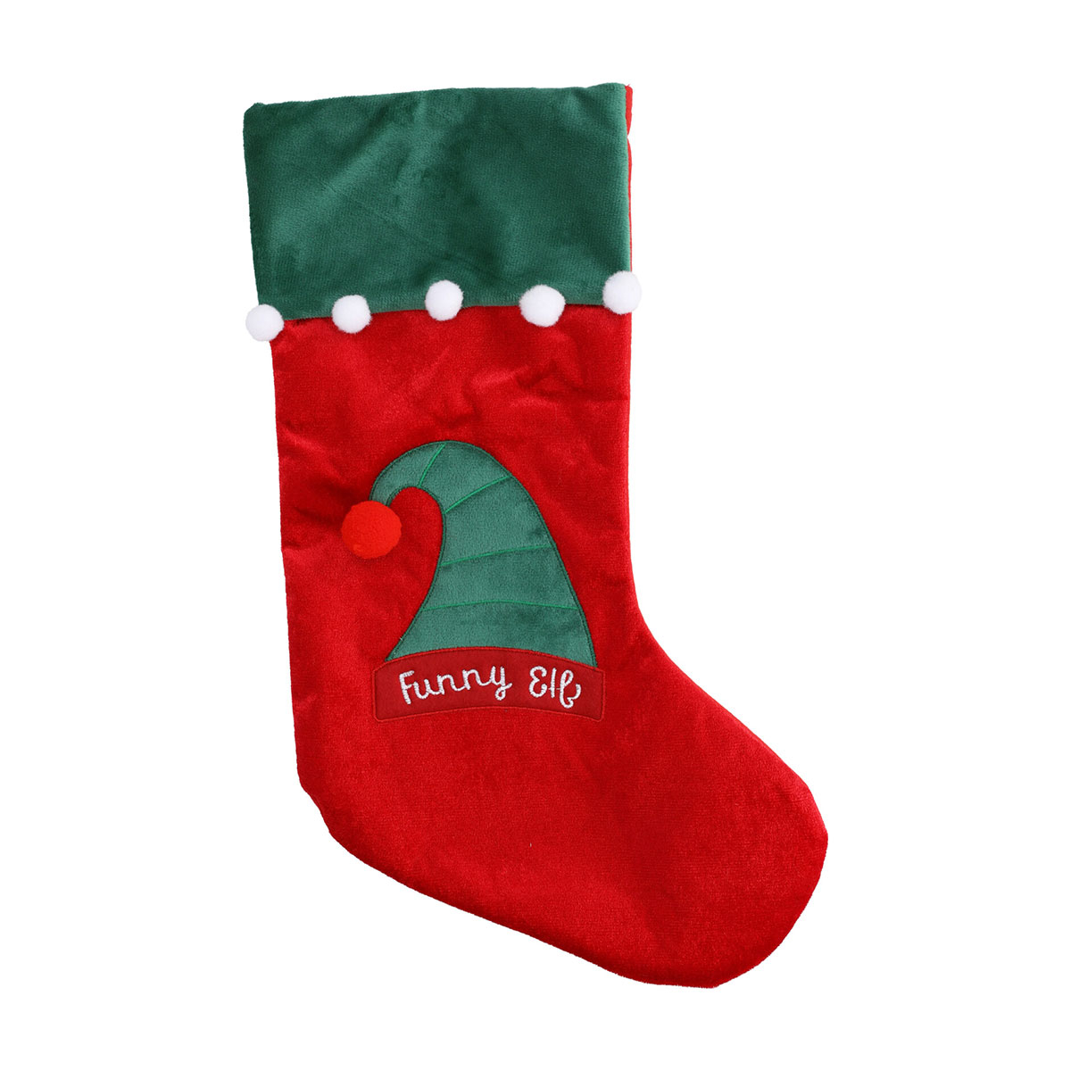 Χριστουγεννιάτικη κάλτσα Funny Elf σε πράσινο-κόκκινο χρώμα με λευκά πομ πομ. Το βελουτέ ύφασμα από 100% Polyester προσφέρει χουχουλιάρικη αίσθηση και ζεστασιά στον χώρο. Ιδανική για να την κρεμάσετε στο τζάκι ή την πόρτα και να τη γεμίσετε με γιορτινές εκπλήξεις. Συνδυάστε την με τις υπόλοιπες κάλτσες της σειράς για να δημιουργήσετε την δική σας ομάδα ξωτικών, διαλέγοντας διαφορετική κάλτσα για κάθε μέλος της οικογένειας.