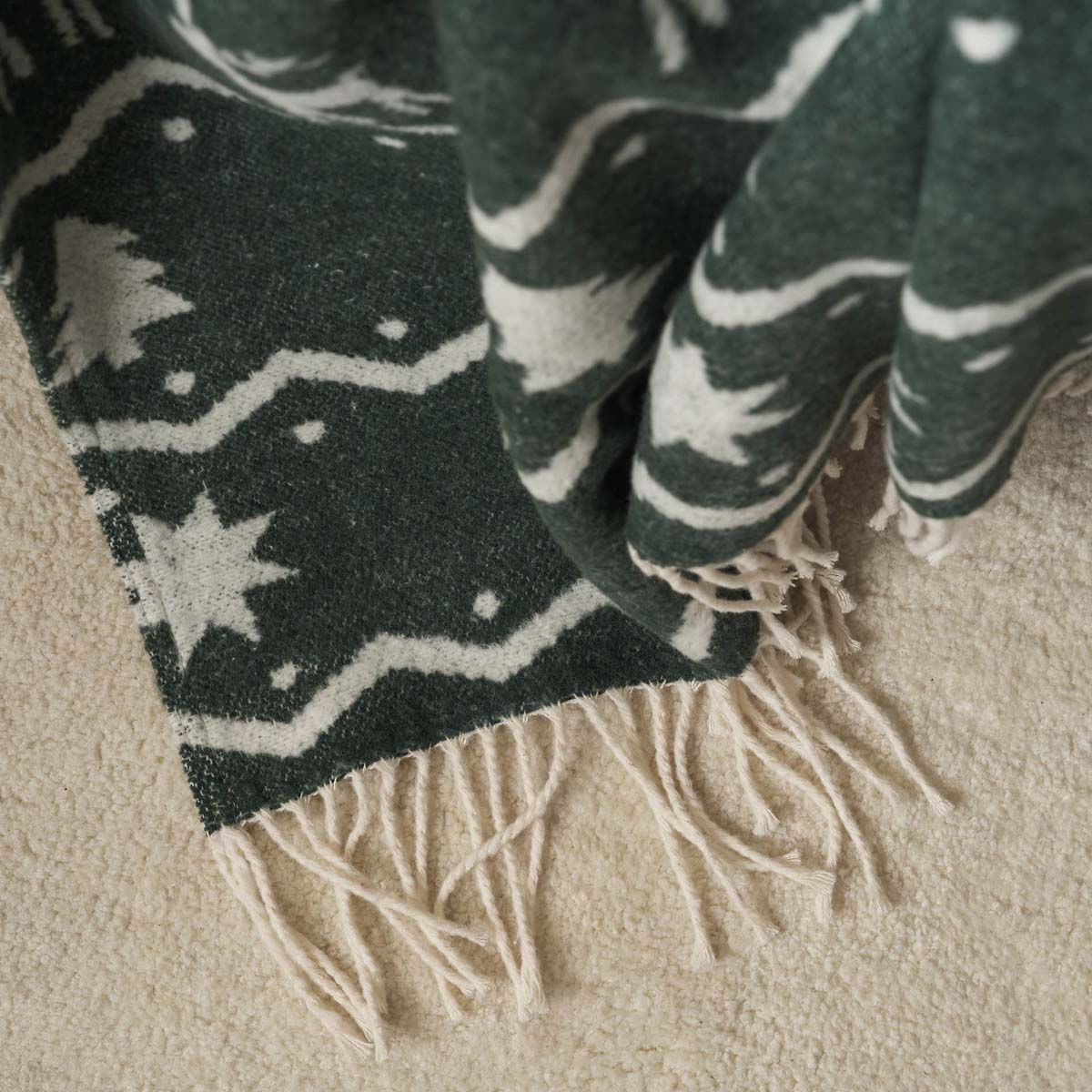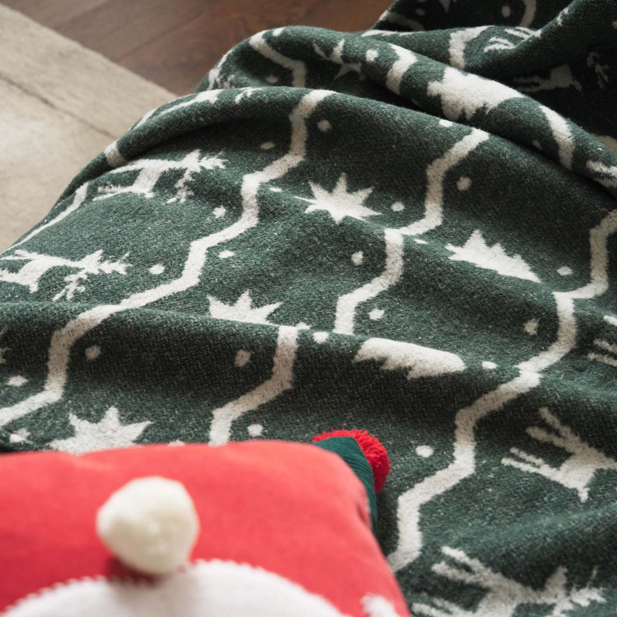 Χριστουγεννιάτικη κουβέρτα καναπέ από την εταιρία Gofis Home σε πράσινο χρώμα με λευκά σχέδια. Κατασκευασμένη από απαλό χνουδωτό ύφασμα σύνθεσης 80% βαμβάκι και 20% polyester, με μακρύ κρόσσι στο τελείωμα. Είναι ιδανική για να στολίσει τον χώρο του καθιστικού σας και να σας ζεστάνει, δίνοντας μια μοναδική χριστουγεννιάτικη ατμόσφαιρα.